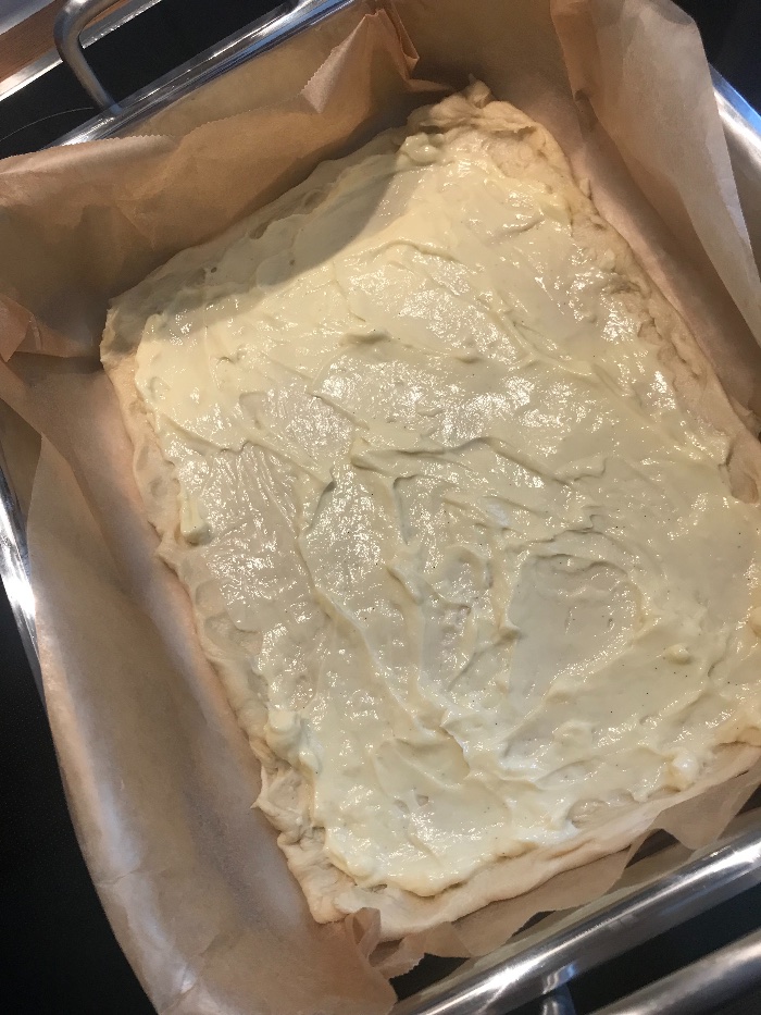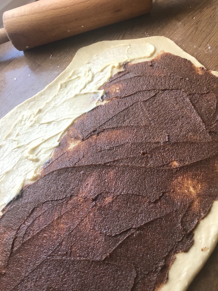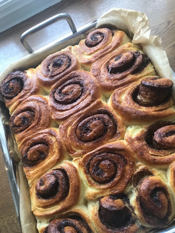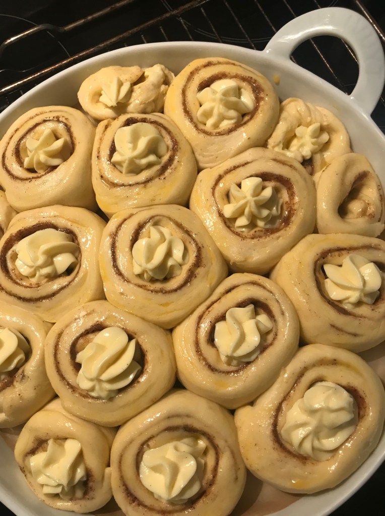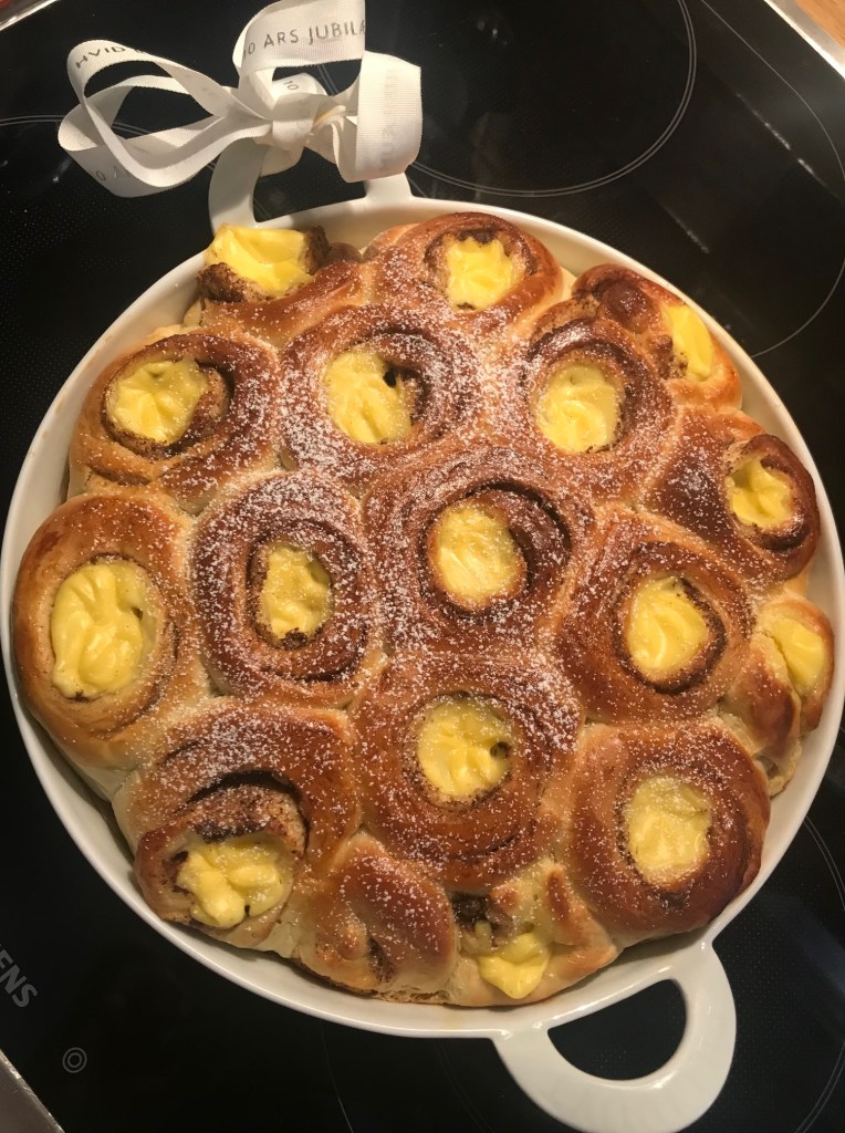 Ha alt i kjøkkenmaskinen unntatt smør, elt i 10 minutt, tilsett så smøret litt etter litt, ha deigen på benken, ta vekk 1 bit som bakes ut, og legges i bunn av formen slik bilde viser, kjevle ut resten av deigen, smør halve deigen med kanelsmør, resten med eggekrem. Sett til heving i ca 45 minutt, pensle med egg, og stek på nederste rille på 200 grader i ca 25 minutt… Kanelsnurrer i 220 grader i ca 11 minutt.