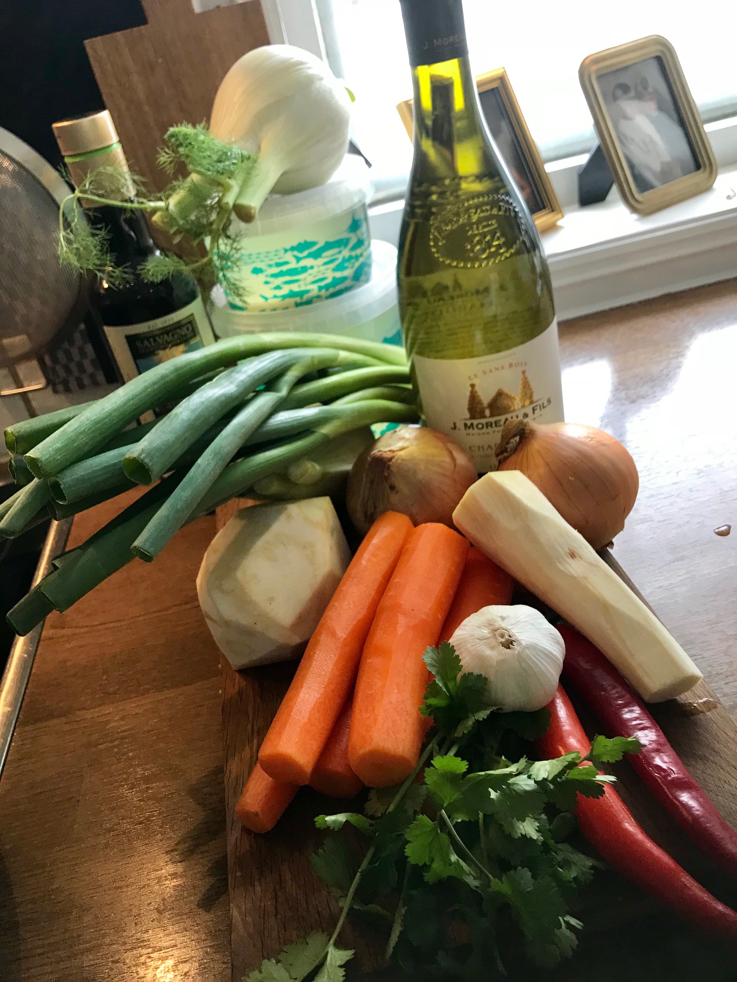 Hell hvitvin i gryte og tilsett sjalottløk, løk , fennikkel og chili, kok opp, la det koke til hvitvin er redusert til ca 2 ss