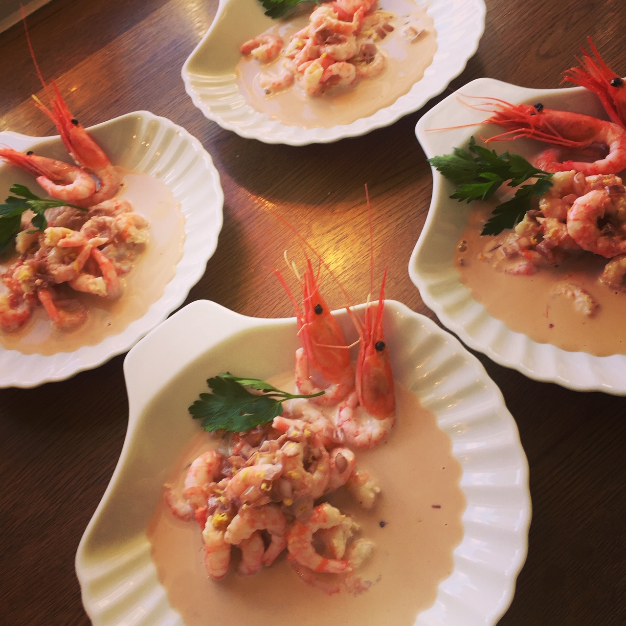 Når gjestene kommer, varmes sausen forsiktig opp, når den koker tilsettes sitronskall og reker.. trekk kasserollen tilsides, rekene må ikke koke.