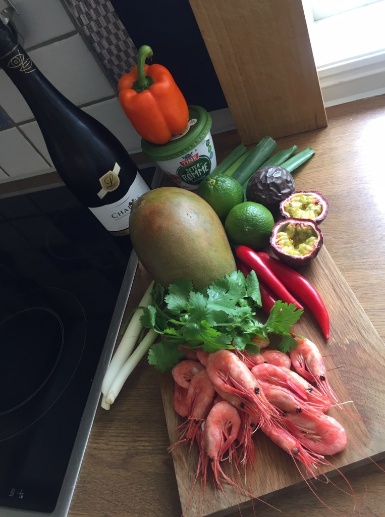 Tilslutt tilsettes chilisaus og koriander, bland dette og tilsett rekene.