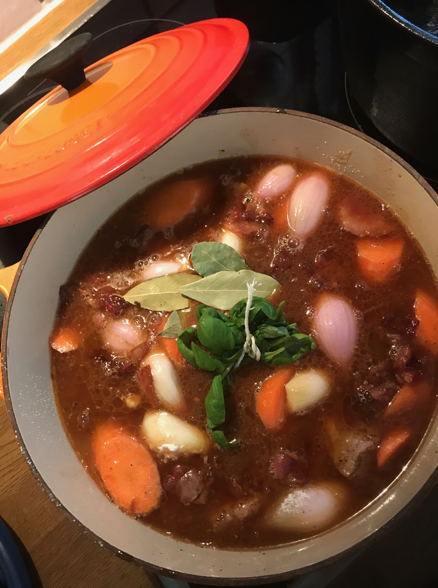 Skjær kjøttet i terninger, ikke for små, og brun disse.. hakk bacon og sopp og brun dette lett. Del sjalottløk i 2,pluss finhakk hvitløk, og skjær gulrøttene i skiver. Fordel alle ingrediser i 2-3 lag, alt etter grytestørrelse, sikt hv.mel over hvert lag, pluss salt og pepper. Tøm over all væske, legg persillekvast og lauvbærblad på toppen.