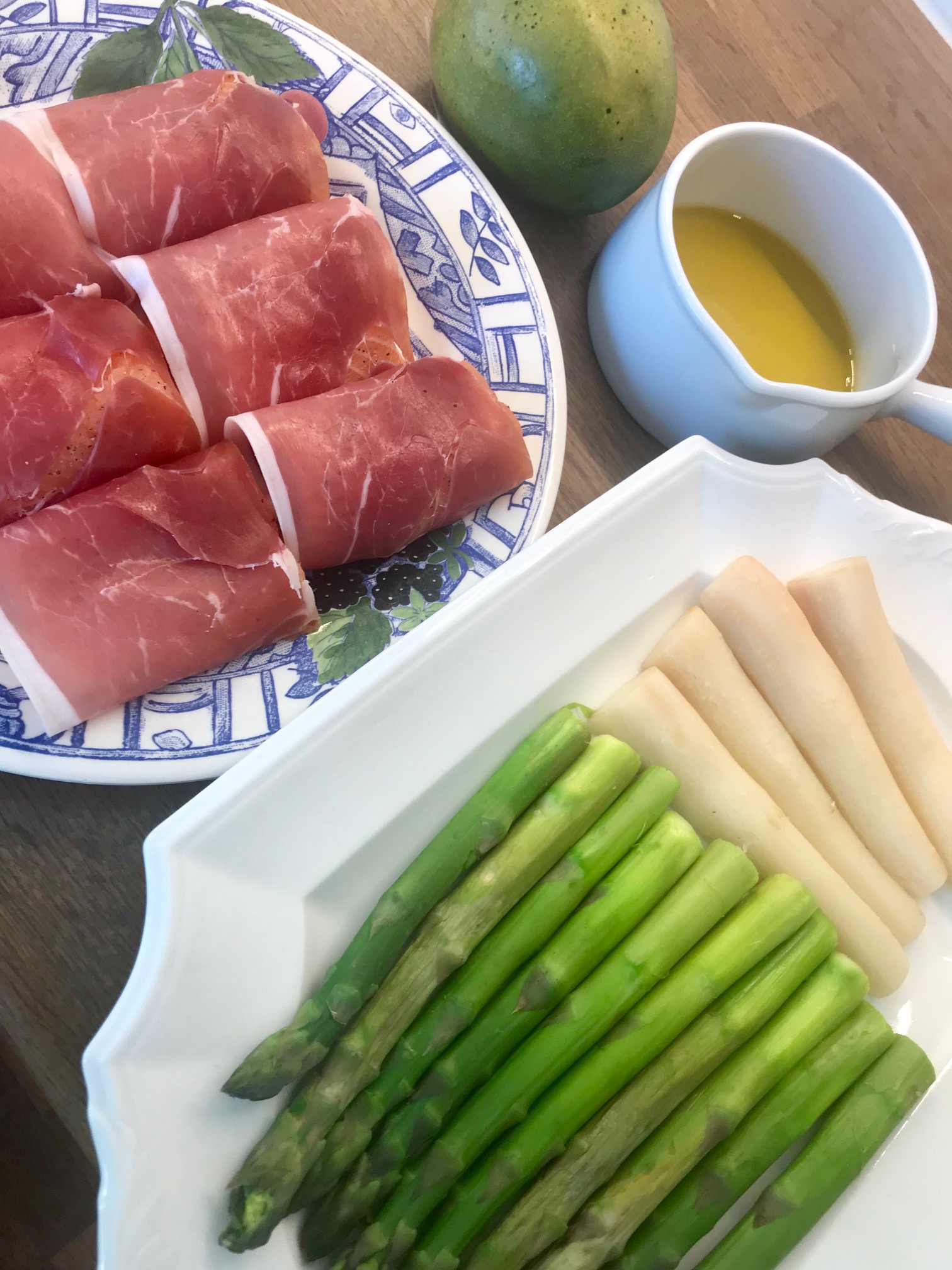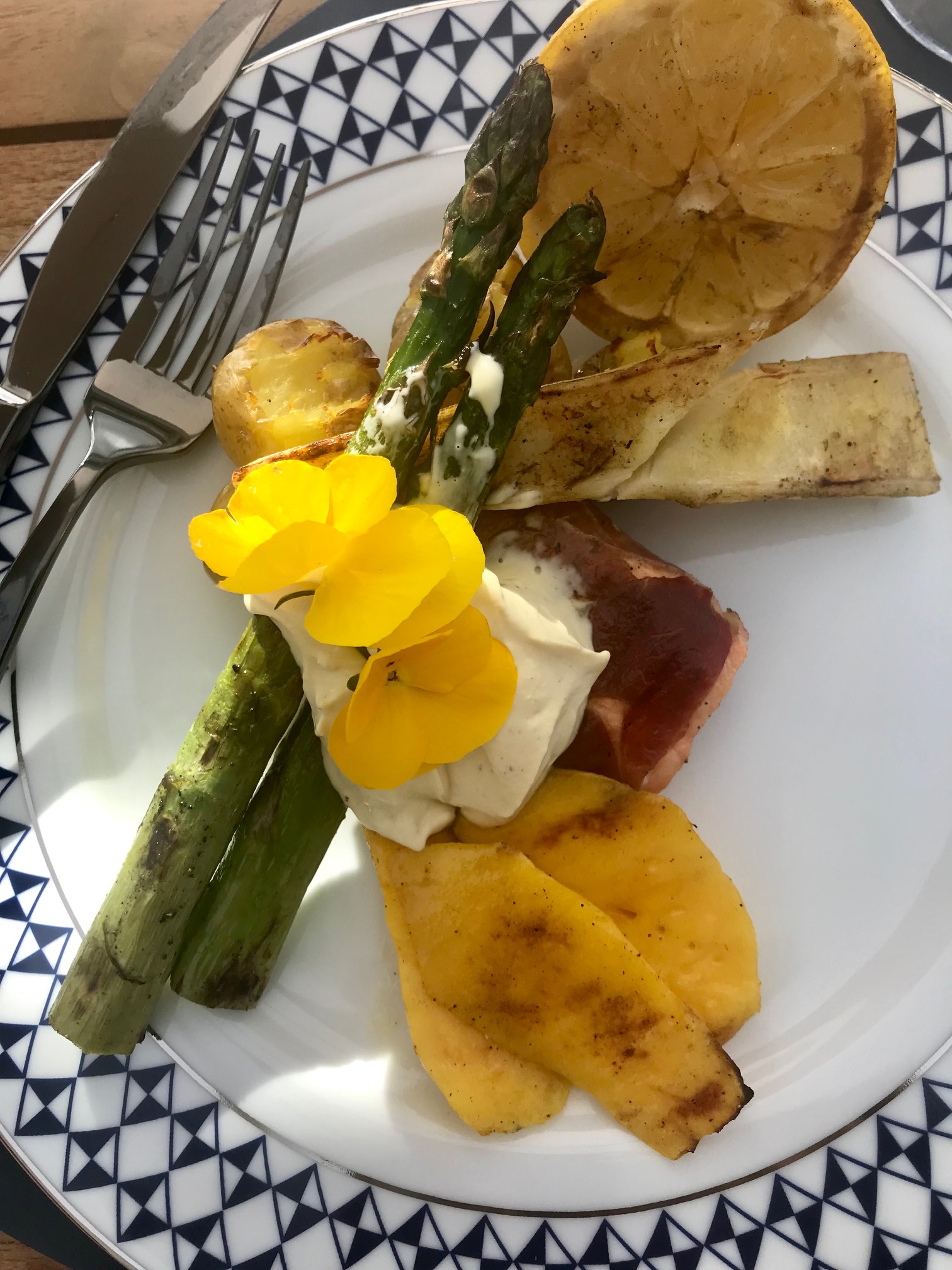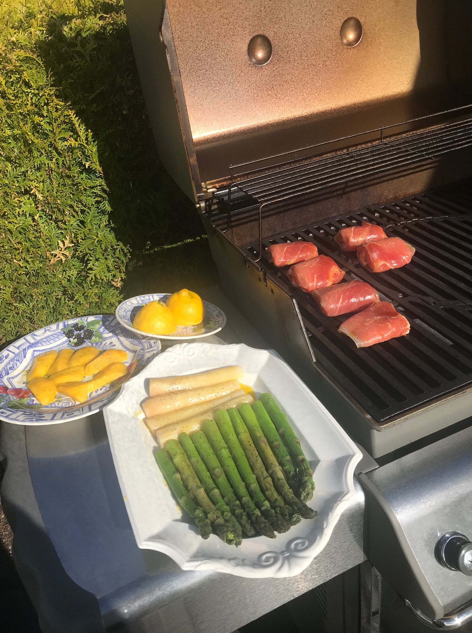 Legg fisken på grillen først, den trenger ca 8-10 minutt, aspergers 1 minutt på hver side, mango og persillerot ca 3 minutt på hver side..