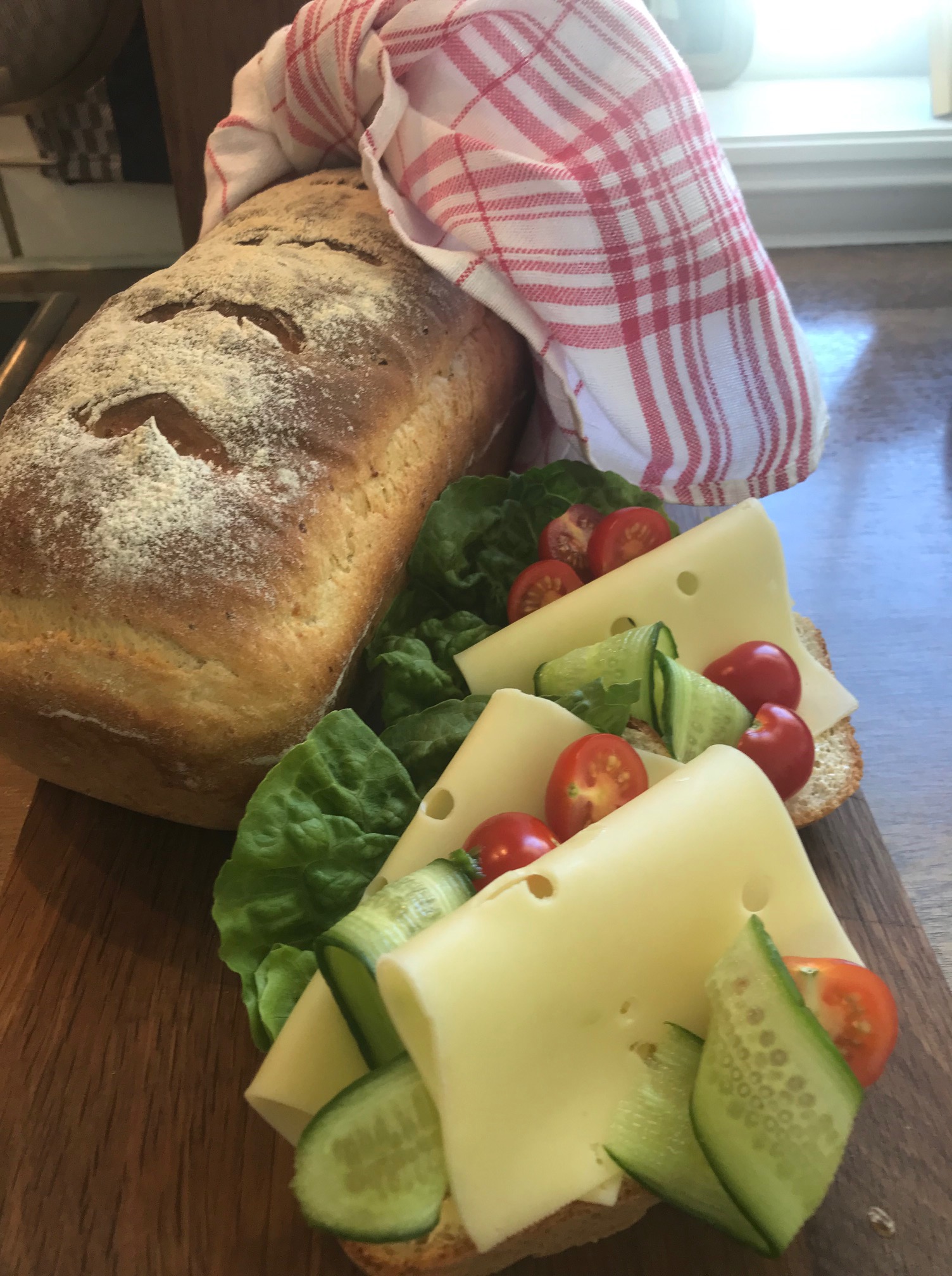 Elt så ut to store brød, etterhev ca 45 minutt, pensle med vann, stekes i 45 minutt på 210 grader..