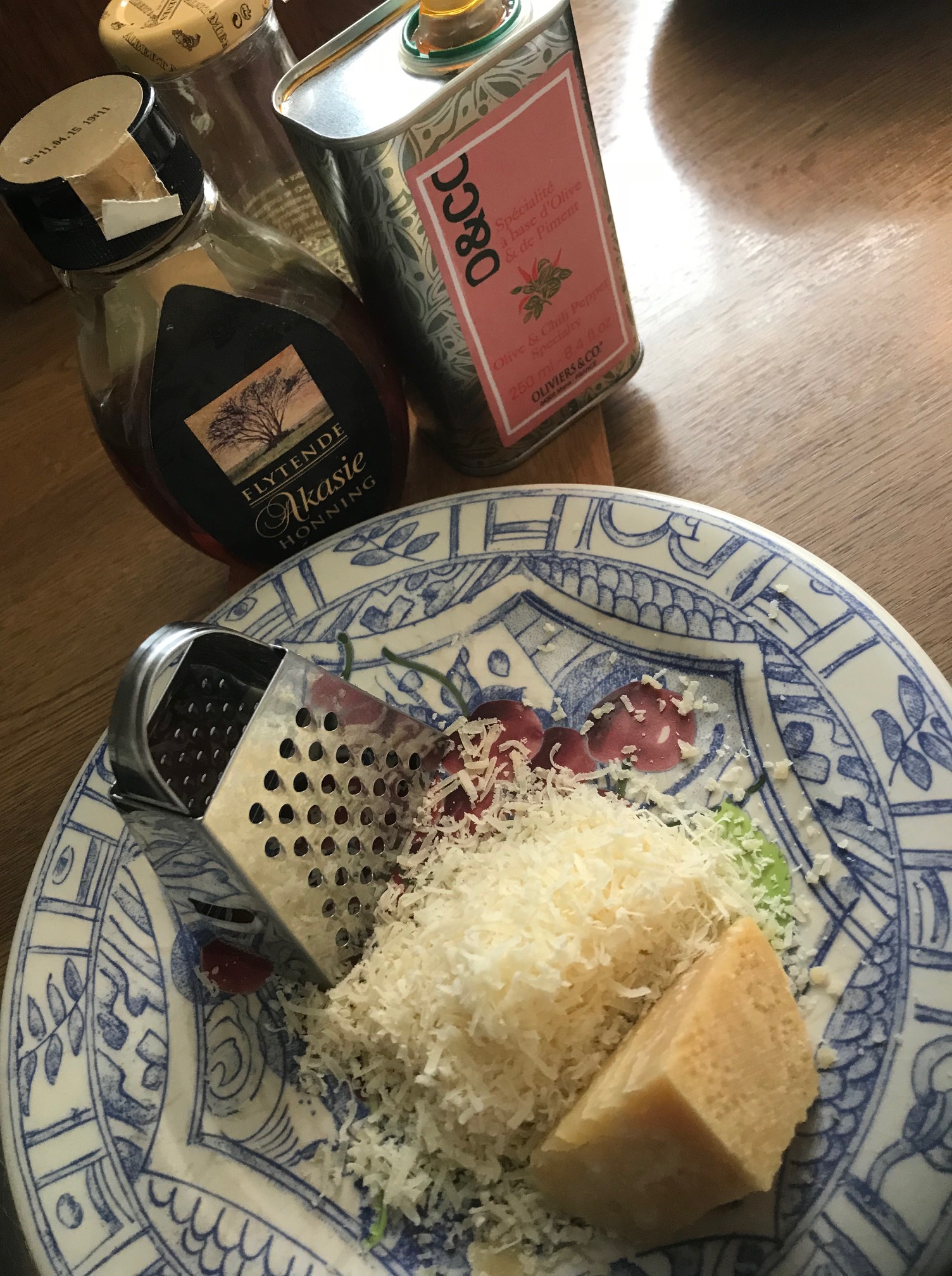 Ha ca 900 gram hvetemel i mikseren, tilsett 2 dl parmesan, og bland sammen. Hvis deigen er for bløt tilsett mer på slutten av eltingen