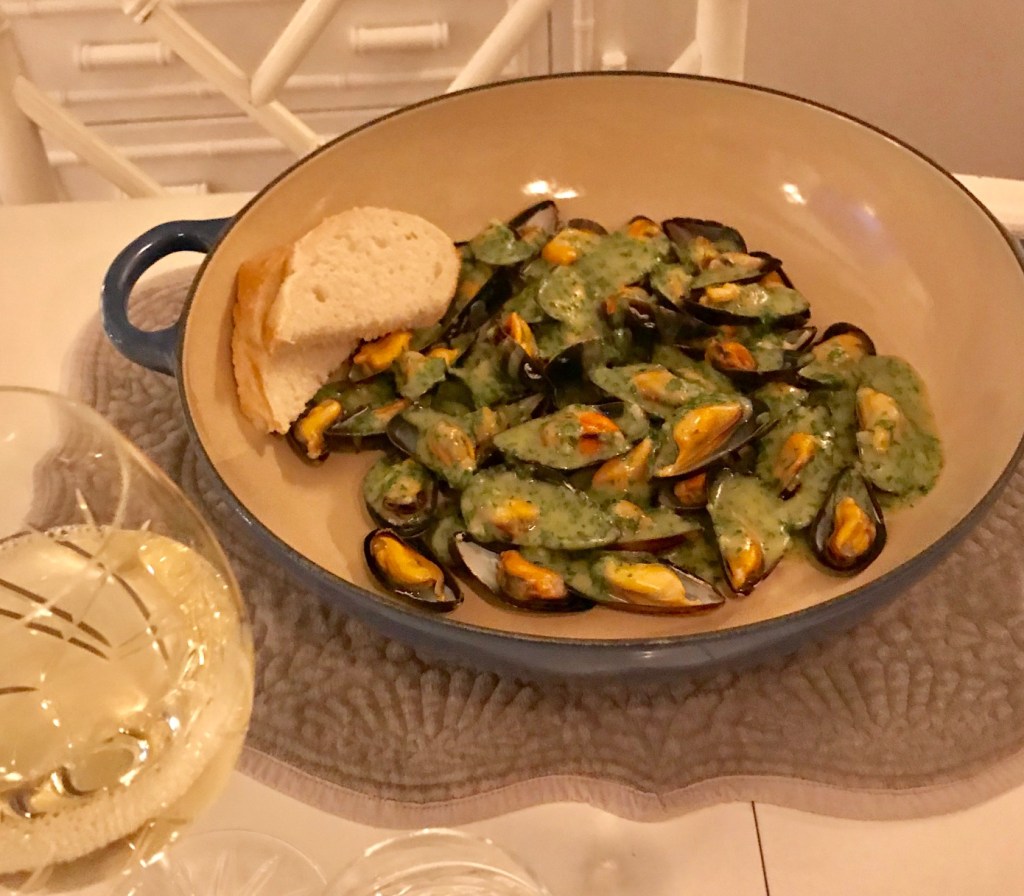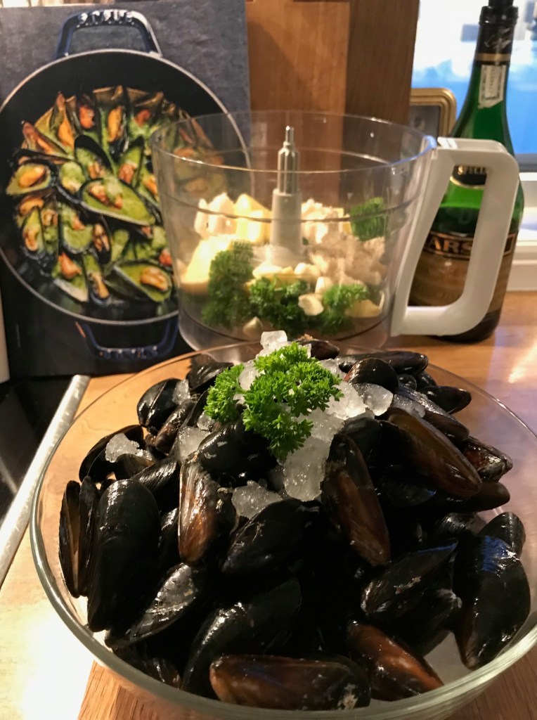 Så er det bare å vaske blåskjell, og sjekke disse, tøm 1 dl hvitvin i bunnen av en stor kjele, fyll opp gryta med blåskjell, og kok på full styrke i 3 minutt.