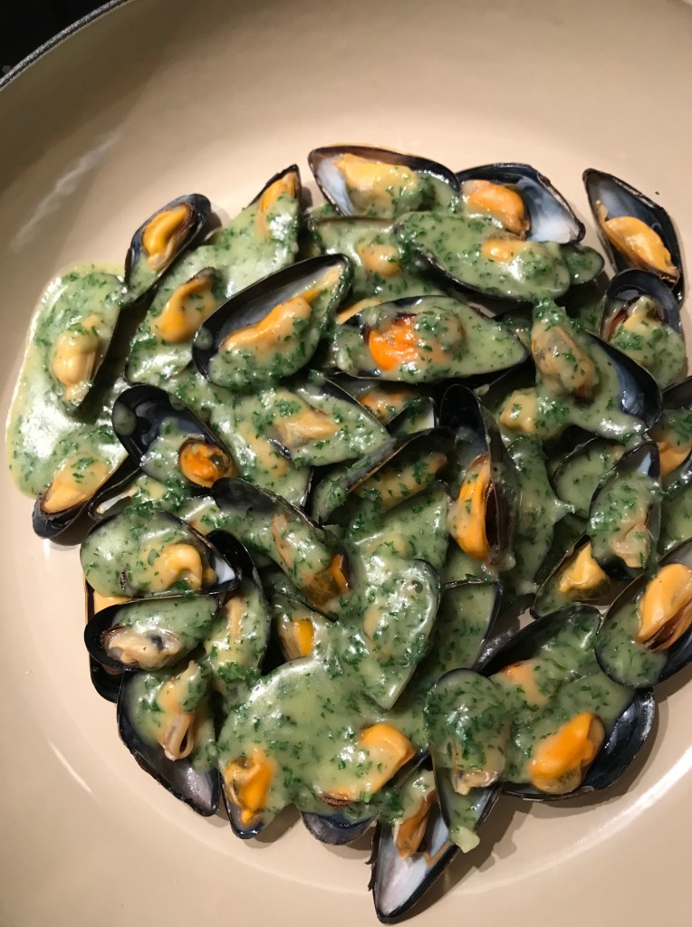 Tilsett persillesmøret i den kokende blåskjellkrafta, kok dette i 2 minutter, eller bare så du ser den tykner..