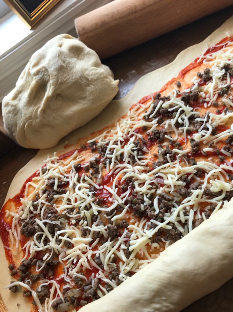 Til denne deig porsjon, bruker jeg ca 500 gram karbonadedeig, 3 hakket sjalottløk, hvitløksalt, og pepper etter smak. Dette grynes i stekepanne mens deigen heves.