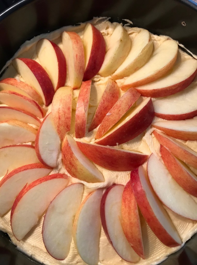 Et godt tips, siden det er viktig å få kaken i ovnen fort, skrell eplene og legg i sitronvann, da blir de ikke brune..