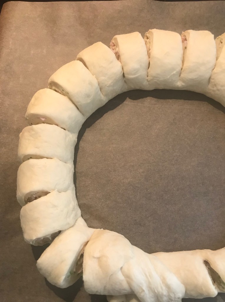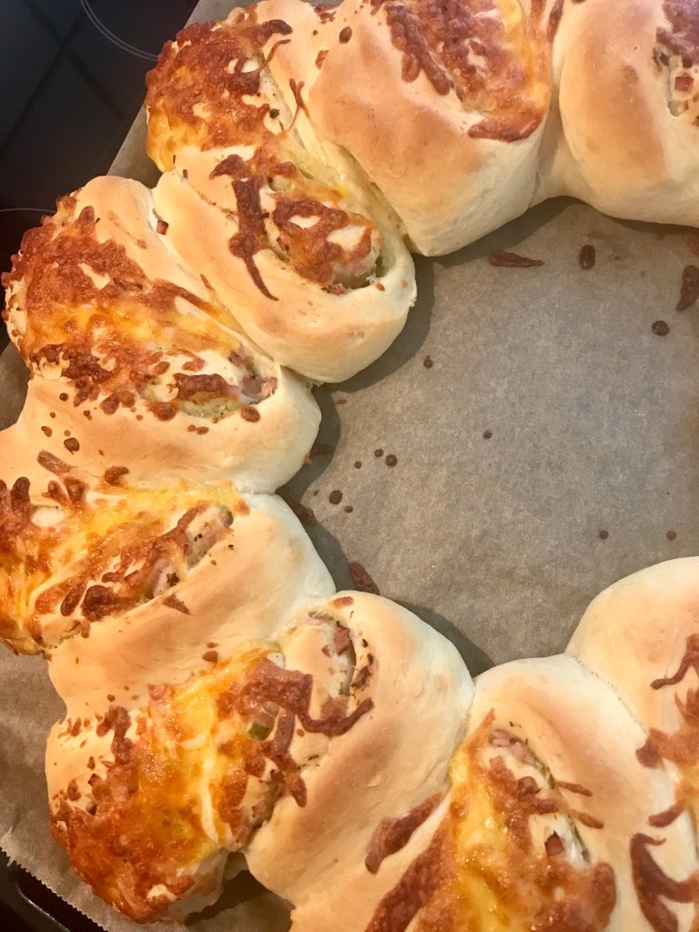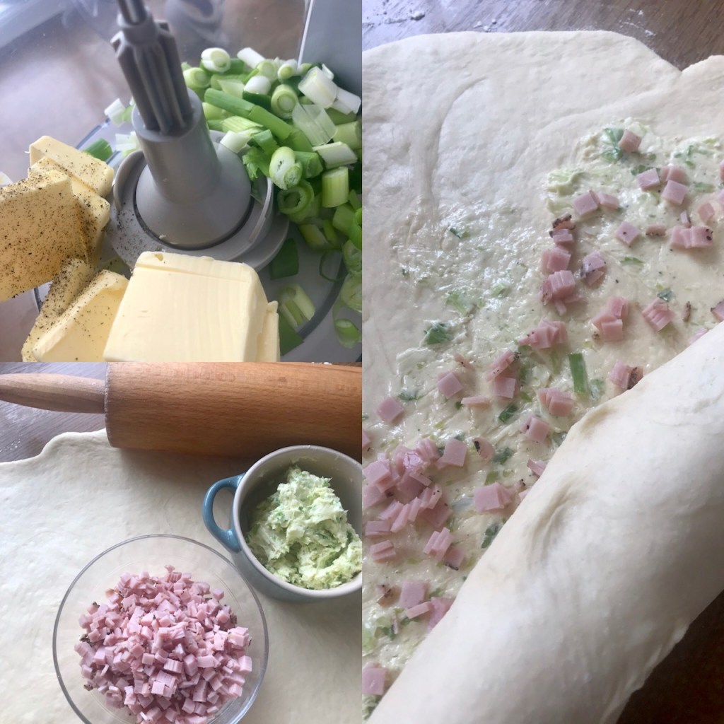 Denne oppskriften laget jeg i 2016, da jeg jobbet i Oslo. Bladkrans forbindes kanskje mest med eggekrem, kanel eller rosiner.. Denne er basert på salt, null sukker, med fyll beståene av vårløksmør og kokt skinke, men teknikken er samme som den søte varianten.
