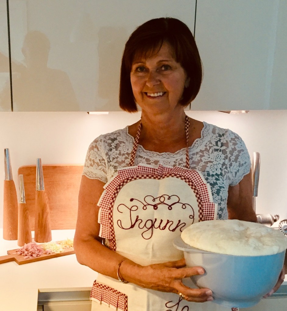 Ha alle ingredienser i kjøkkenmaskin, unntatt salt og smør, elt dette på lav hastighet i 12 minutt.. elt så inn salt, pluss smør litt om gangen, så 1 sps olje, sett til heving i 40 minutt, stekes på 220 grader i ca 13 minutt. Etter den er bakt ut, og fyllet er lagt på, rull den, og gjør som på bildet, etterhev i ca 30 minutt.