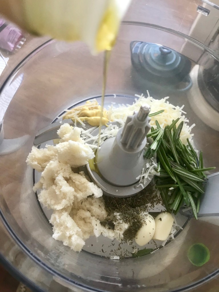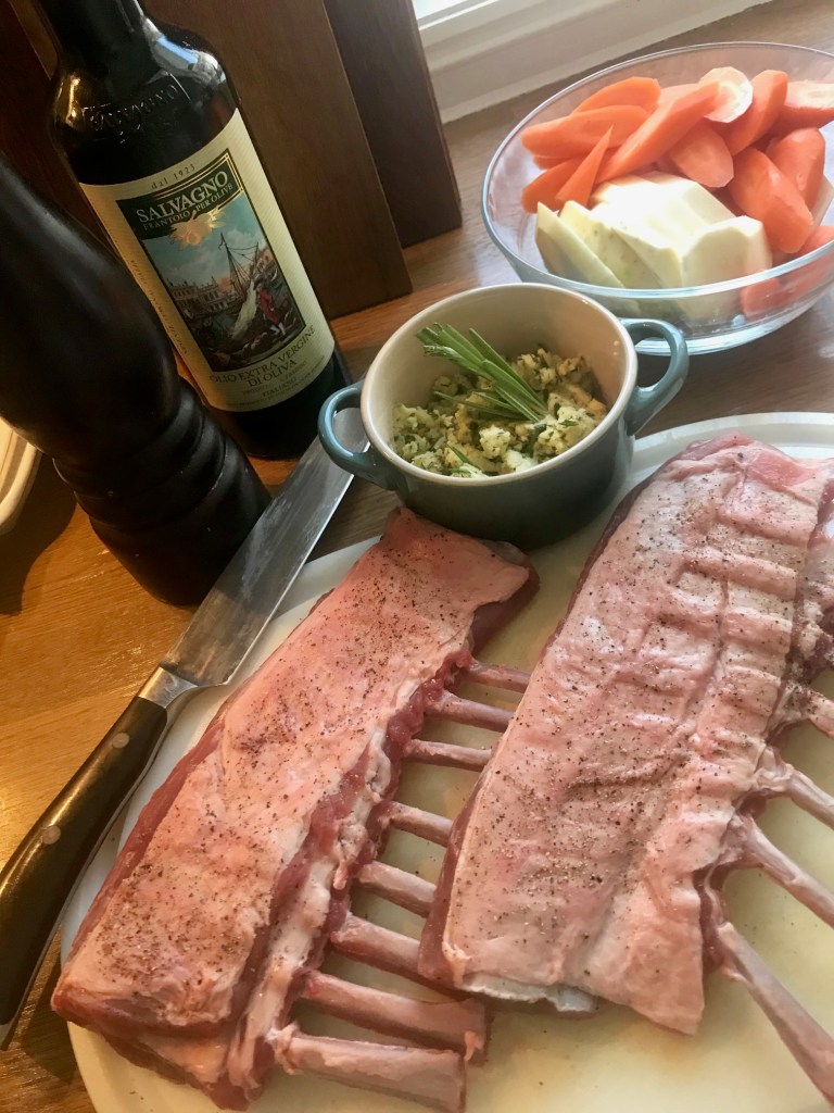 Start med å gni inn lammecarre med salt&pepper, lag topping som vist på bilde, forkok potetene, og sett rotmos på kok..