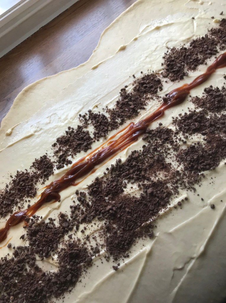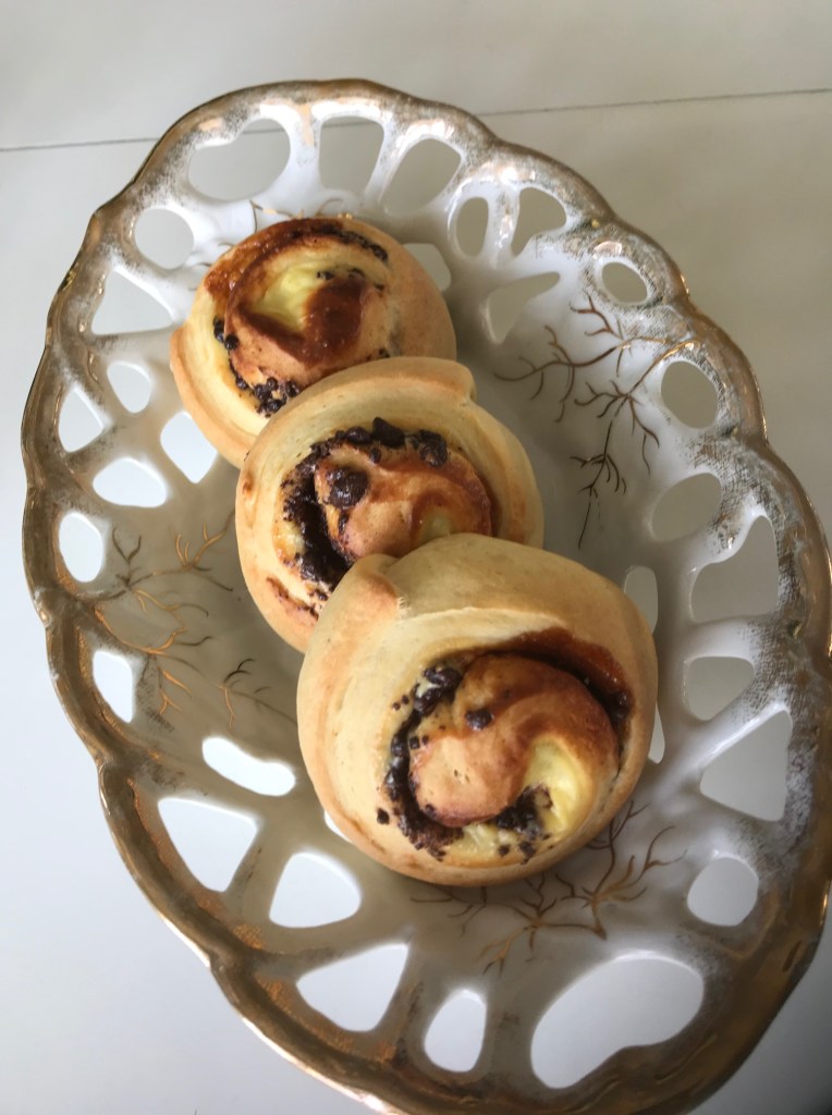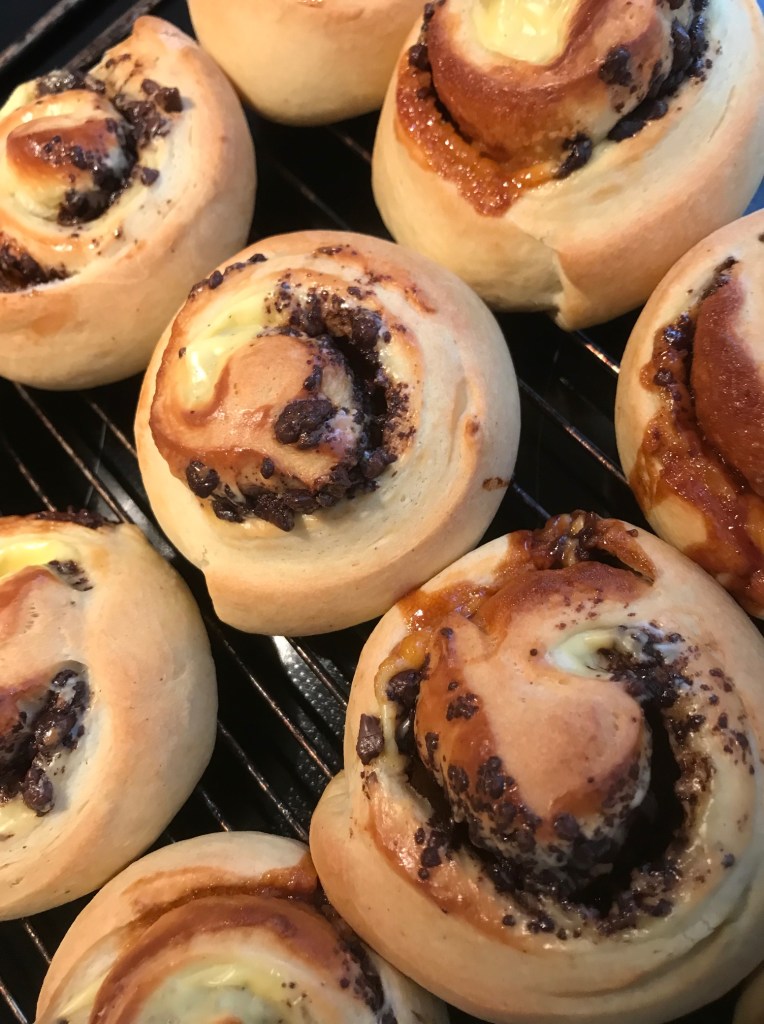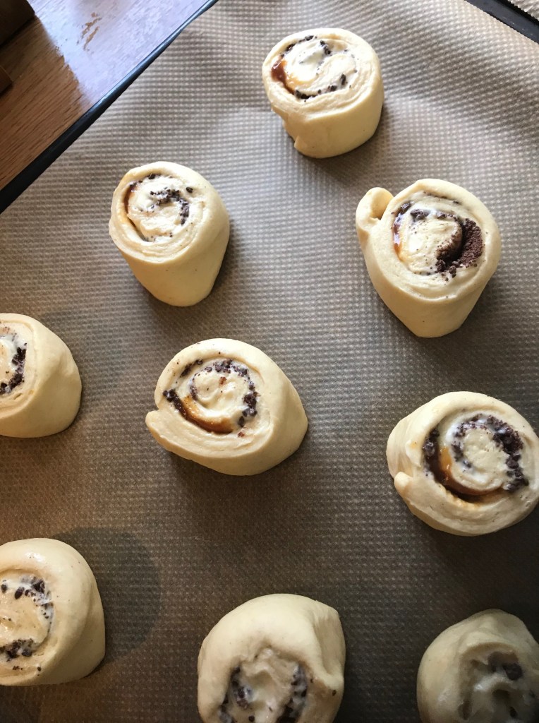 Bak ut en rektangulær deig, smør/strø på fyll, rull sammen, og del opp i passe emner, sett til heving i ca 40 minutt.