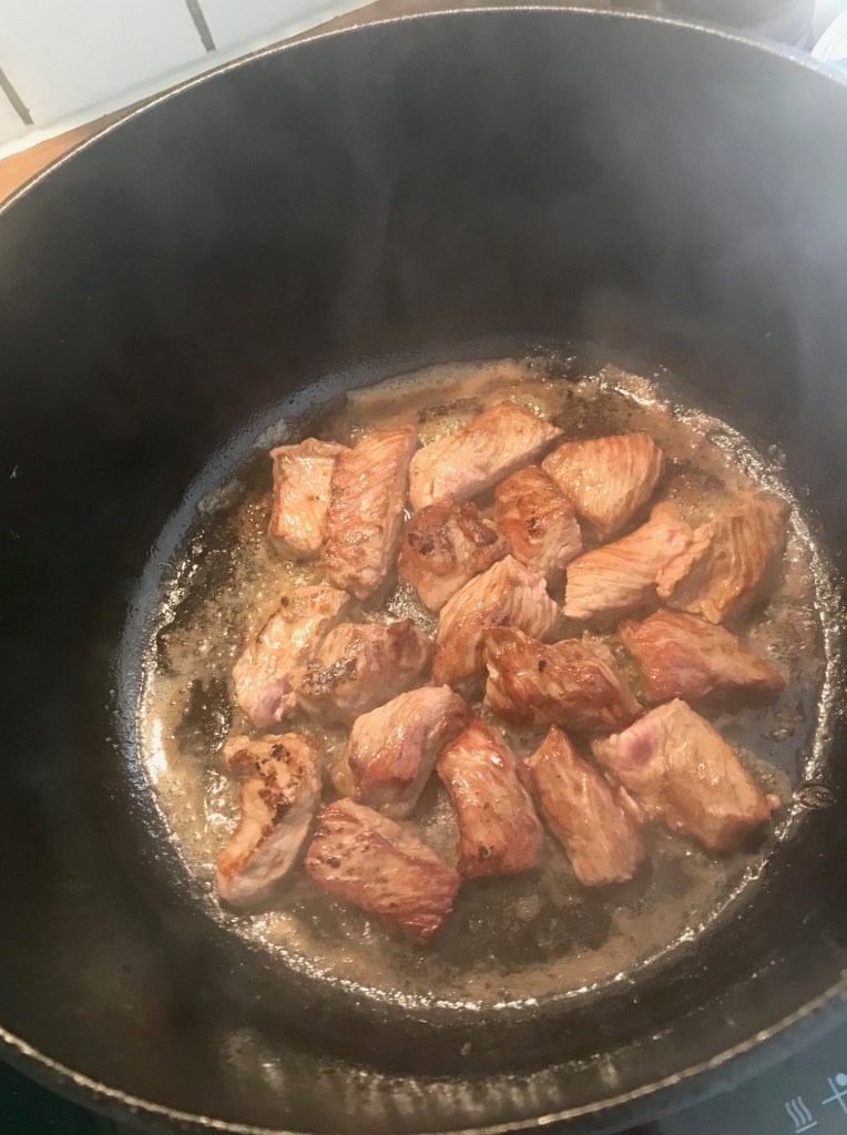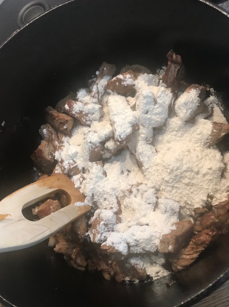 Jevning på mormor sin måte. Dryss melet over det ferdig brunet kjøtt, og rør inn, før du sper med væske.