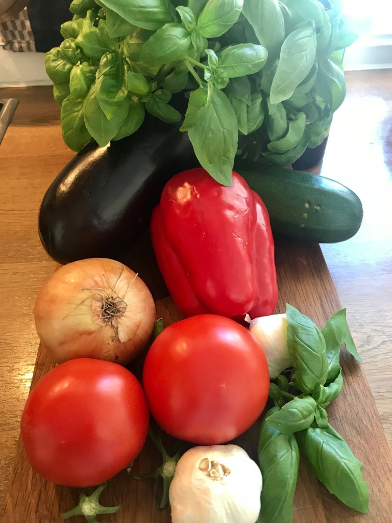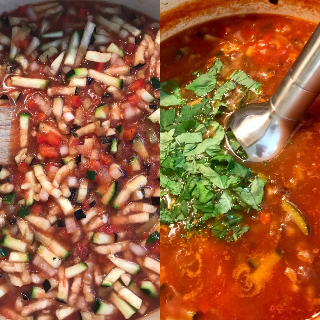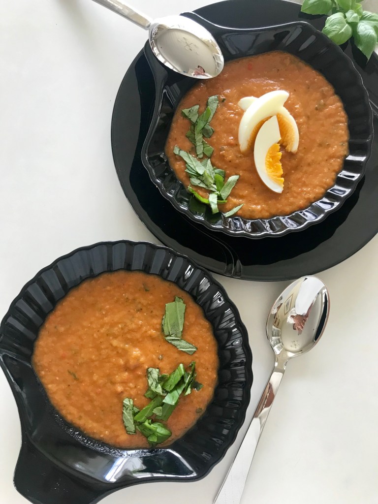 Skrell, og hakk alle grønnsakene, og ha dem i en kjele med olivenolje, og la dette småkoke i 5 minutt, tilsett 6 dl vann, salt og pepper, la dette småkoke på middels varme i 30 minutt.. tilsett frisk basilikum etter smak, og blend grundig til suppen oppnår ønsket kremet konsistens.. smak eventuelt til med mer salt og pepper. Nykokt egg og et godt brød passer godt til.