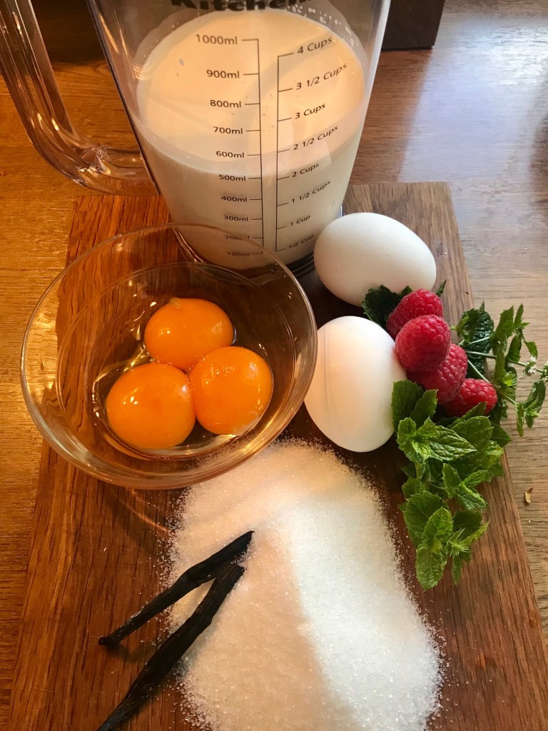 Pisk egg, eggeplommer og sukker lett sammen, del vaniljestangen på langs, og ha den i en gryte sammen med fløte/melken, kok opp, og la det avkjøle i 10-15 minutt, ta opp vaniljestangen, skrap frøene ut, sil eggeblandingen gjennom en fin sikt, inn i fløteblandingen.. deretter over i formen, dekk med folie og kok puddingen i vannbad på 130 grader i ca 90 minutt.. sjekk med en bakepinne. Sett formen kaldt, den må være helt avkjølt før den hvelves og pyntes.