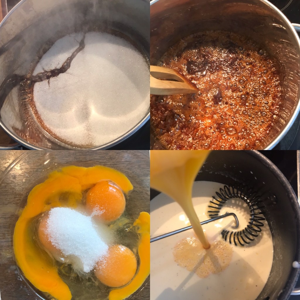 2 dl sukker pluss 3/4 dl vann eller cognac,jeg bruker cognac , det gir en fantastisk smak.. smelt langsomt,( ikke bruk gryte med belegg) ikke rør før sukker er smeltet, trekk gryten av platen, og tilsett væske. Tøm i en egnet form, og snu karamellen rundt i formen,både bunn og sider, slik at mest mulig av formen blir dekket av karamellen.