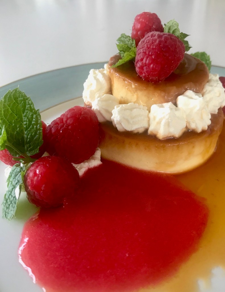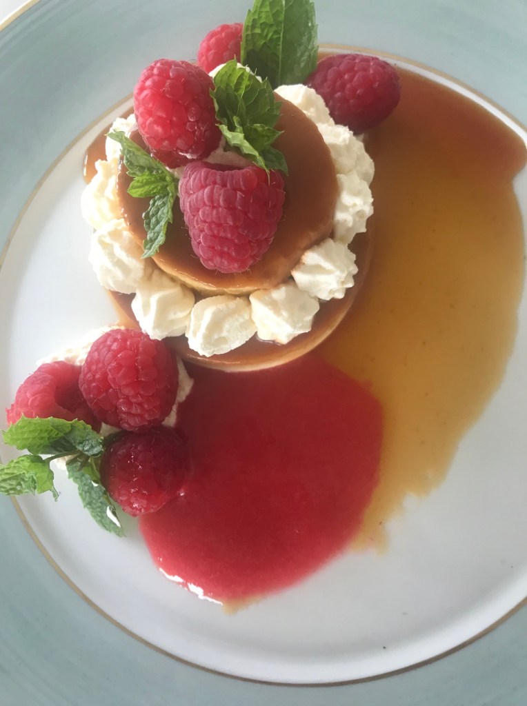 Jeg bruker friske bringebær og frisk bringebærsaus til.. smaker godt sammen med karamellsaus.