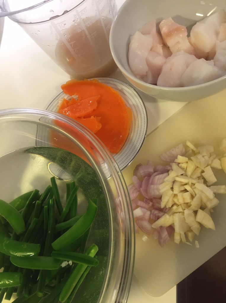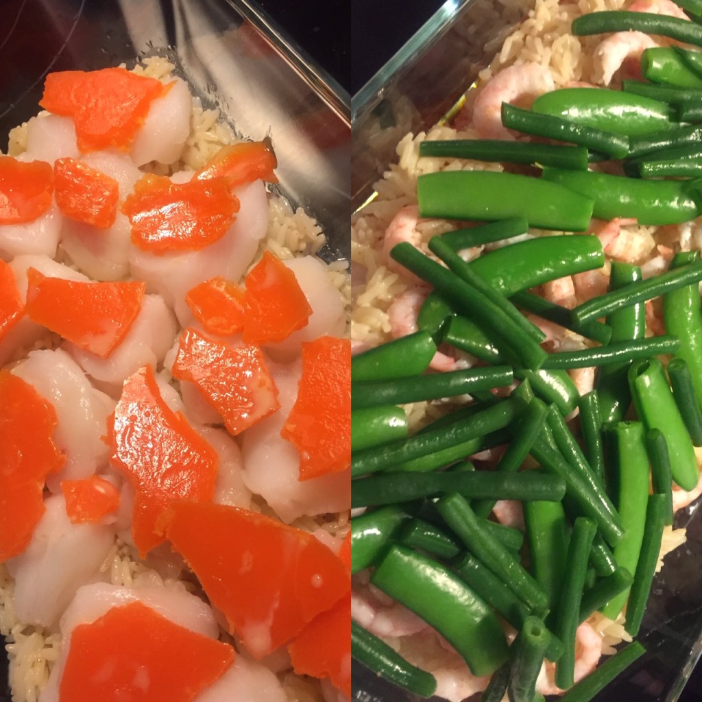 Fisk:Skjær fisk i terninger. Pill reker, og ta vare på skallet til kraft og smør. Rens grønnsakene og kok i lettsaltet vann i 30 sekunder, så i kaldt vann. Legg litt ris i bunnen av en ildfast form, fordel fisken utover, legg litt kaldt rekesmør over fisken,så et nytt lag med ris, sett inn i ovnen på 200 grader i ca 5 minutt. Fordel så reker og grønnsaker over, og stek videre i ca 4 minutt. Ta litt smør over og server rett fra formen.