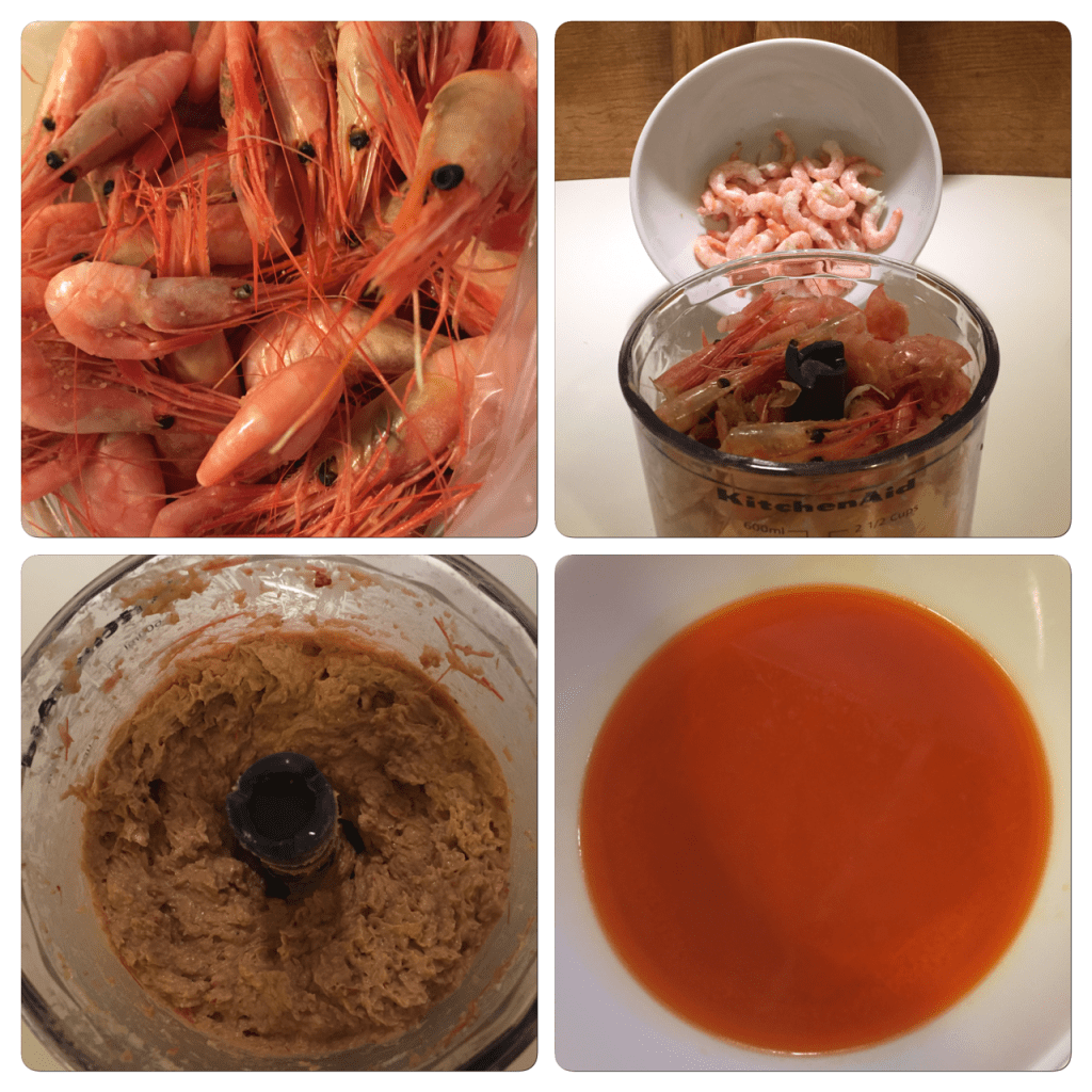 Rekesmør: Kjør rekeskall og smør i en kjøkkenmaskin, kjør til du får en fin masse, tilsett gjerne noen ekstra reker her. Varm en opp en kjele, og fres rekesmør til det smelter, ha på 5dl vann og kok i 10 minutt. Filtrer smøret gjennom en sil, eller en gasklut, og sett kaldt. Når det er kaldt kan du ta smøret av toppen. Legg smøret i en boks, og ta vare på rekekraften som ligger under, dette kan gjøres dagen før.