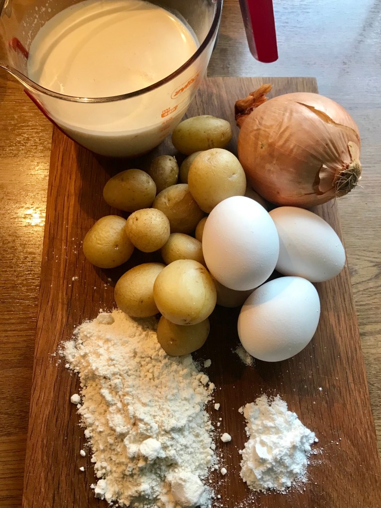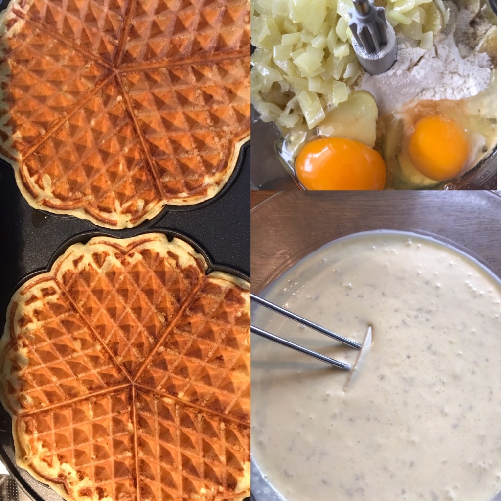 Løken freses i smør til den er blank og myk, alle ingredienser unntatt fløtemelk mikses i en kjøkkenmaskin til dette er en fin mos, spe med fløtemelk til slutt. Smak til med salt/pepper. Stekes i vaffeljern til de er gyllenbrune.