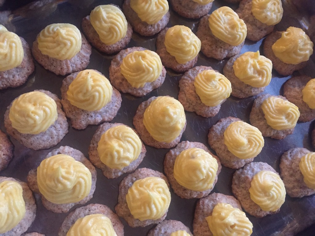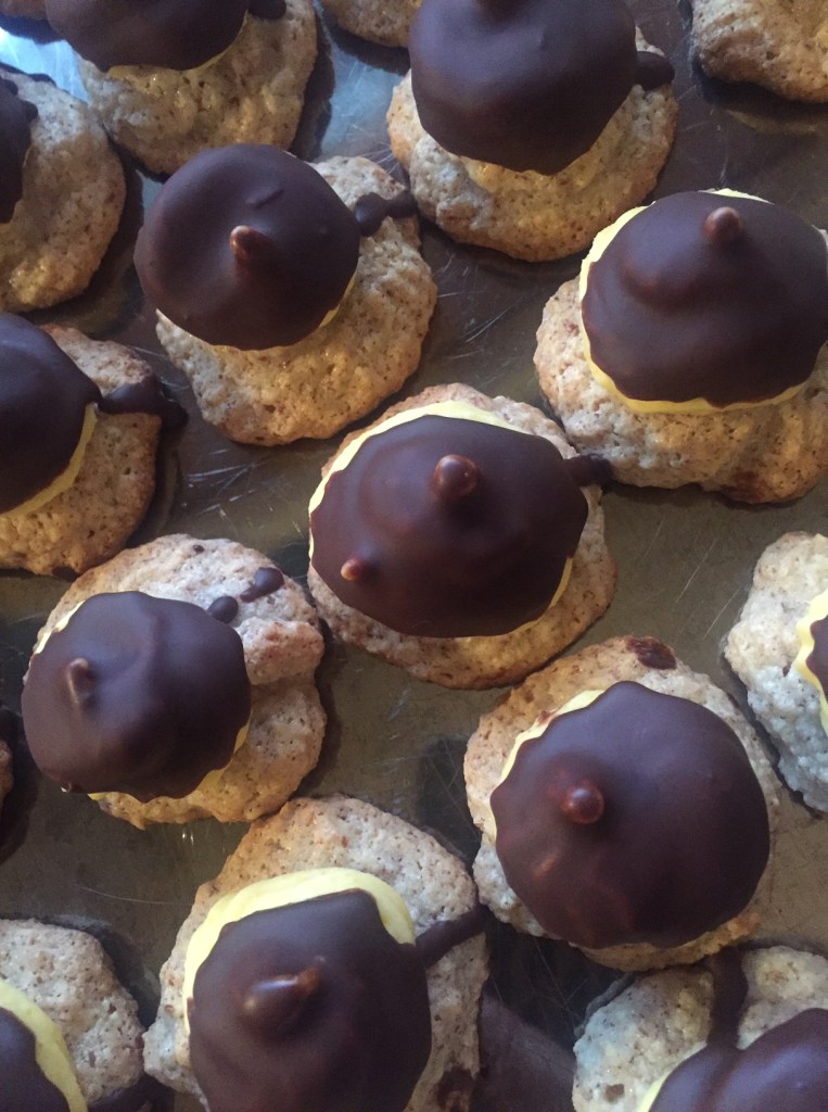 Bruk en sprøytepose , og fordel sjokoladekremen/ gul krem på mandelmakronene slik at de får høy, rund fasong. Sett kakene på et brett og legg i fryseren til sjokoladekremen på kakene har stivnet.
