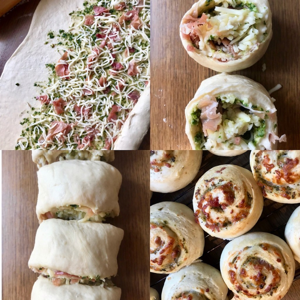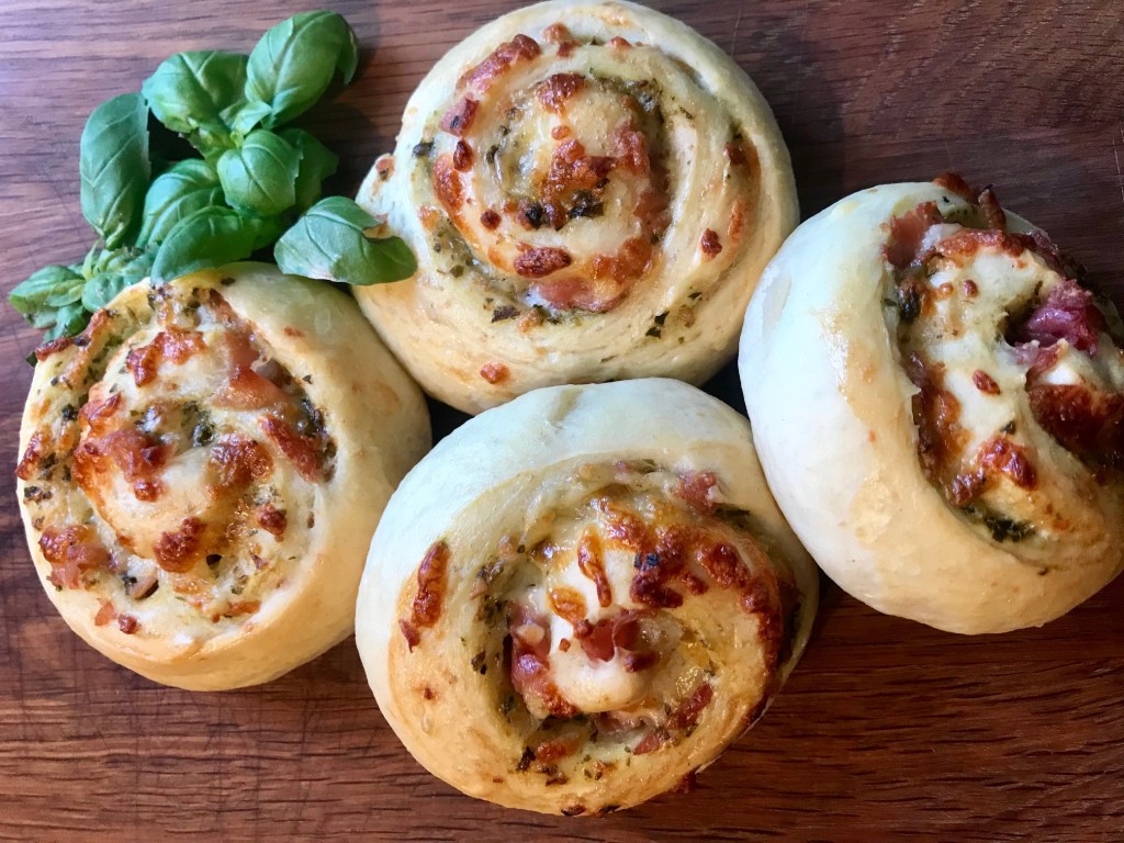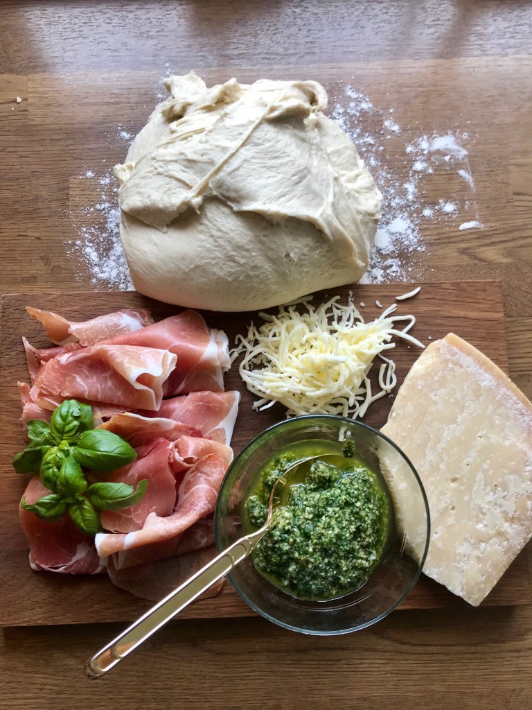 Dette er en oppskrift jeg har brukt pizzasnurrer som utgangspunkt, men med små justeringer, jeg brukte serranoskinke, men parma eller salami passer også til pesto, ønskes en mildere versjon, bruk vanlig kokt skinke. Deigen har kun en heving, er lett å arbeide med, gir ca 25 snurrer. Har ikke brukt salt i deigen, fyllet gir nok saltsmak.