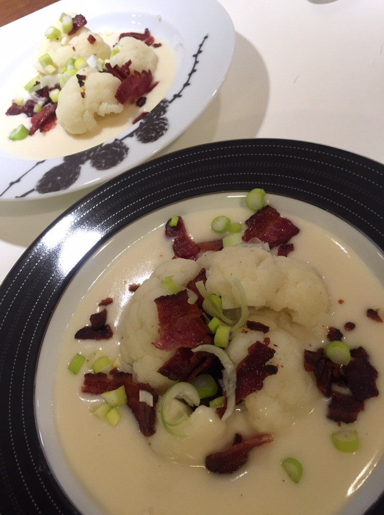 Kok blomkål i lettsaltet vann, sil fra kokevannet.. smelt smør i gryten, og rør inn hvetemel, spe forsiktig med blomkål/kyllingkraften.. tilslutt tilsettes fløten, gis et oppkok og smak til med salt og pepper. Legg blomkål bukettene i oppvarmet skåler, hell suppen over, og strø sprøstekt bacon og hakket vårløk på toppen.