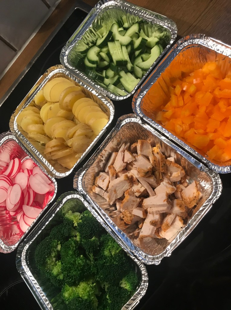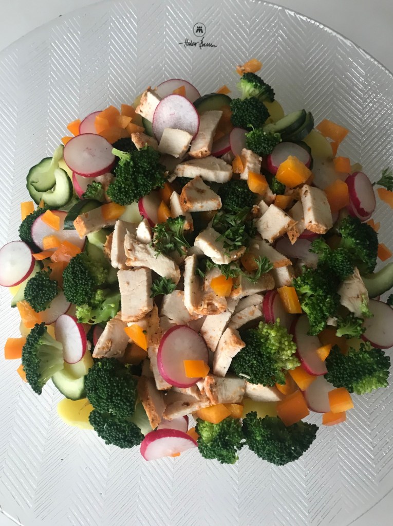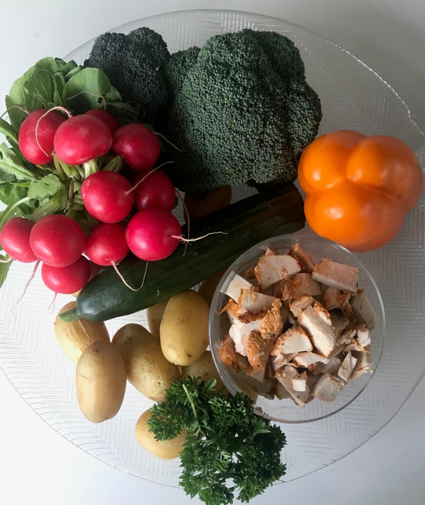 Forhåndskok poteter, og sett til litt avkjøling.. del brokkoli i små buketter, forvell i lettsaltet kokende vann ca 3 minutt, og kjøl hurtig ned i kaldt vann.. Del agurk i 2, og fjern kjernen, del den i skiver, samme med reddikken, hakk paprika , og ha kylling og hakket persille på toppen. Tilsett vinaigrette rett før servering.