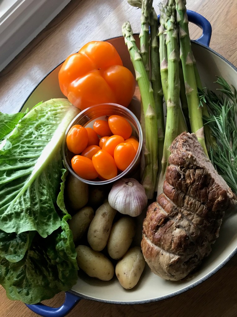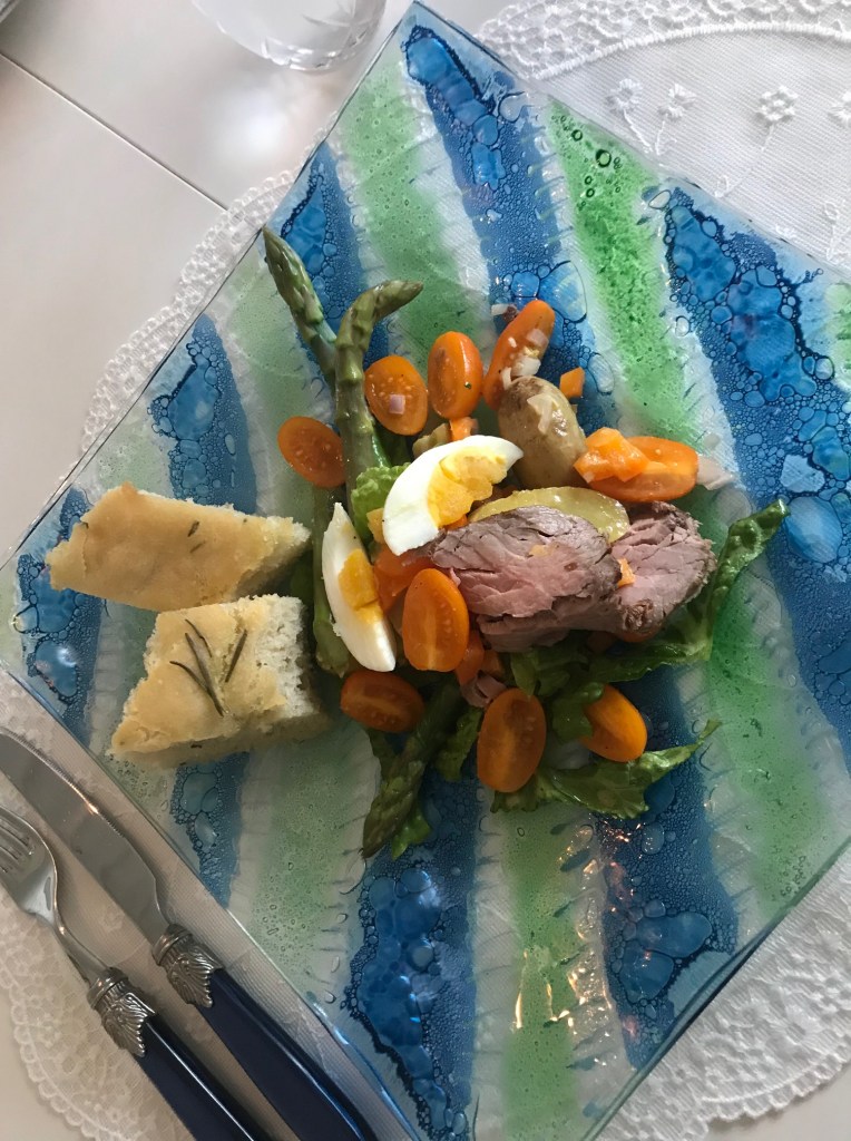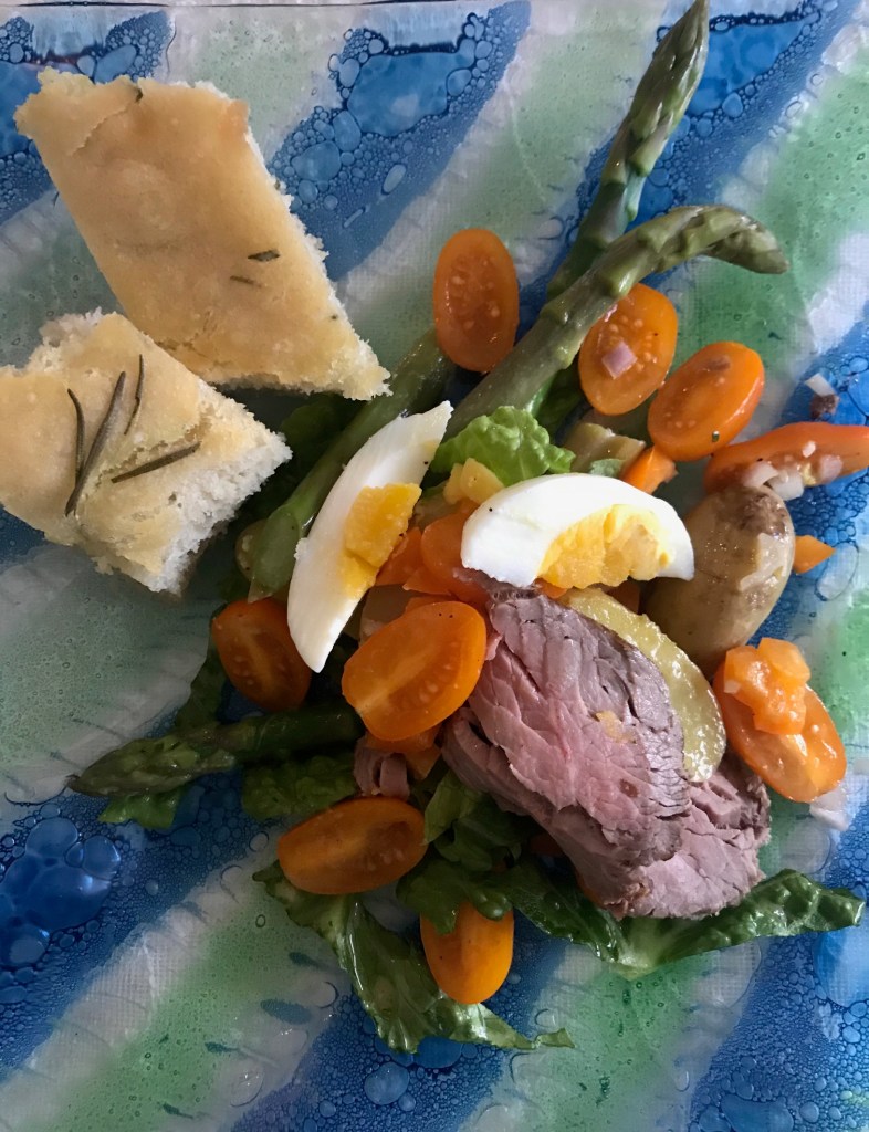 Prøver å servere salat som hovedmåltid minimum en gang pr.uke, det er både sundt og godt, dette er i utgangspunktet en vegetar rett, inspirert fra Claus Dalby sin bok Mitt grønne kjøkken, men jeg hadde litt roastbiff etter helgen, tilsatte et par kokte egg, pluss 1 sjalottløk, sammen med nystekt foccacia ble dette et godt og mettende måltid.