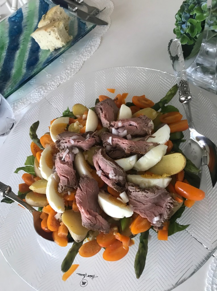 Start med å koke potetene i lett saltet vann, la disse kjølne på benken i et par timer, forkok asperges i 3 minutt, stopp kokeprosessen ved å ha de i iskaldt vann.. kok egg i 10 minutt, hakk salat og paprika, del tomater og poteter i to, legg dette lagvis og ha på dressing rett før servering, om ønskelig ha roastbiff/koktskinke på toppen.. strø eventuelt en hakket sjalottløk på toppen..