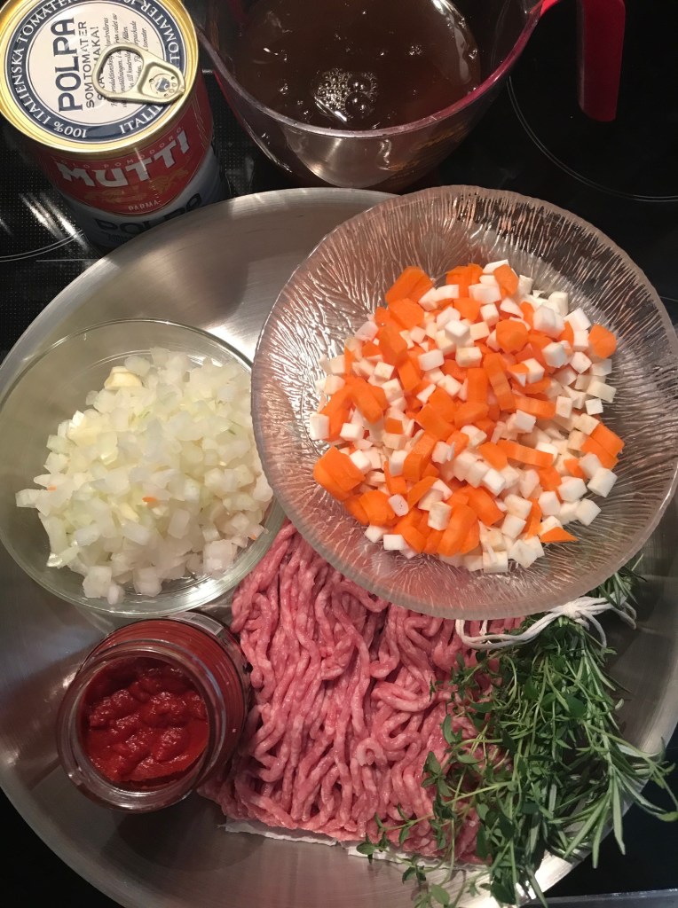 Begynn med kjøttdeiegen som bilde viser, stek den sammen med løk og hvitløk, krydre med salt og pepper, og sett tilside. Varm olje i en gryte, og tilsett gulrøtter, sellerirot pluss chili, la dette surre på svak varme i 5 minutt. Deretter has tomartpure oppi, surr i 1 minutt, så tilsettes hakket tomater, stekt lammekjøttdeig pluss kyllingkraft, lag en krydderkvast som vist på bilde, pluss et par laubærblad, la sausen trekke uten lokk i to timer.. Fjern så krydderkvast og lauvbærblad. Ønskes tykkere saus, rør ut 1 toppet sps maisenna i kaldt vant, og tilsett helt tilslutt.
