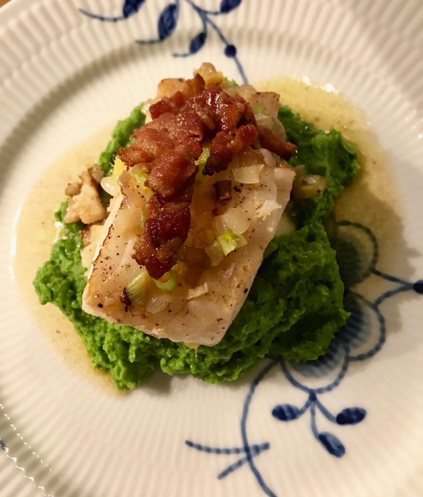 Hva smaker bedre enn et fiskemåltid, med godt tilbehør. Denne retten har kort tilberedingstid, så når gjestene sitter ved bordet stekes fisken, men tilbehøret lages på forhånd. Her servert med rotmos, erterpure pluss bacontopping, sammen med en asiatisk stekesky, blir dette et festmåltid. På denne årstid kommer skreien, her har jeg brukt skrei, men torskeloin smaker også godt. Bruk det som finnes i fiskedisken.