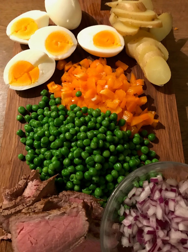Frisk og velsmakende salat, som passer godt til grillmat eller spekemat.. selvfølgelig da uten roastbiff på toppen.. her servert med en god creme fraice dressing.. Salaten er enkel, og potetene kan forhåndskokes i god tid, samme kan erter og egg..