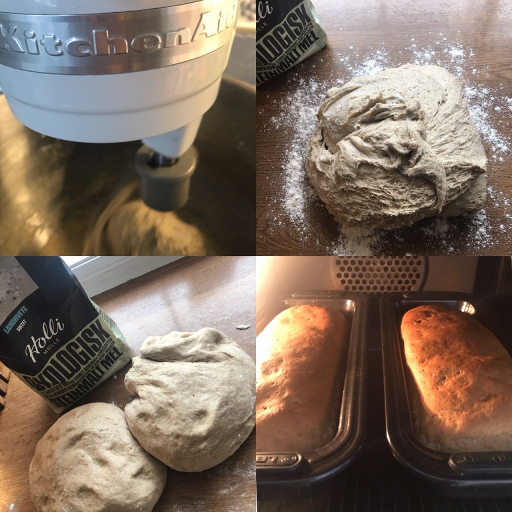Ta så deigen på bakebordet, del i to, la disse hvile i 5 minutt, elt så og legg i to brøformer, etterhev i ca 1 time, pensle med vann, stekes på 200 grader på nederste rille i ca 45 minutt.