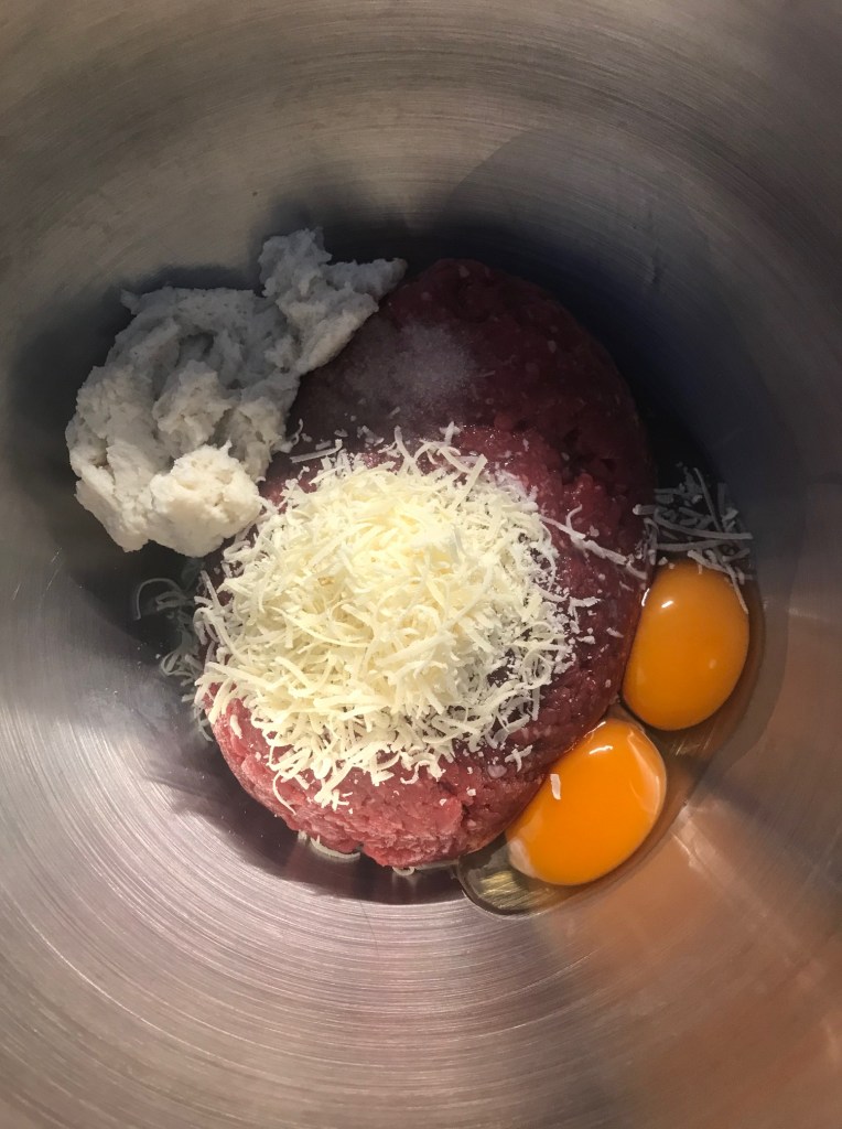 Ha alt oppi bollen som vist på bilde, klem melken uttav av loffbitene, hakk en løk, pluss cayenne pepper, ha dette oppi melken, bruk en stavmikser og hakk dette godt. Spe litt og litt om gangen mens maskinen elter på lav hastighet, tilslutt tilsettes potetmel. Loffskivene og parmesanost gir karbonadene en fin smak og konsistens.
