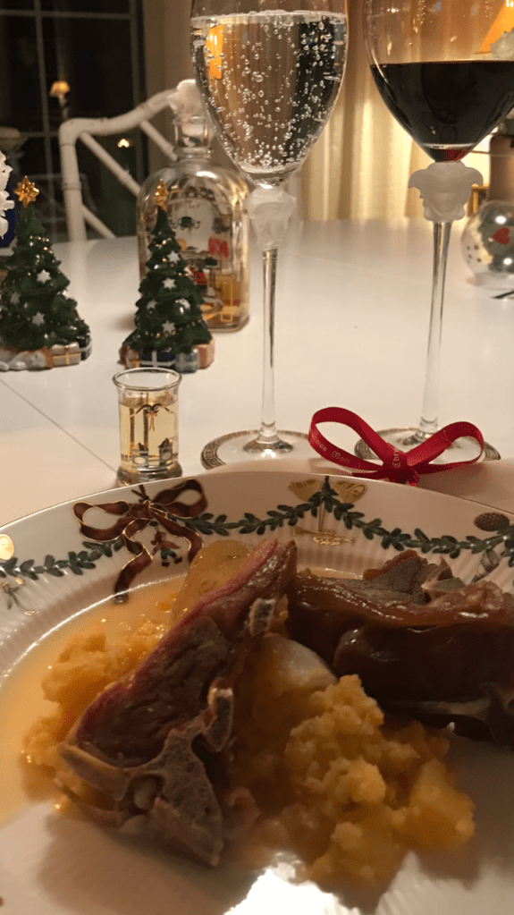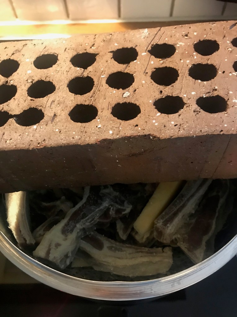 Her er det porsjon for to personer, julaften er kjelen mye større, jeg går til lokal slakter der en får kjøpe bare kottelettkammen, men har noen pinner også,for de som foretrekker det.. her er det brukt kun saltet og tørket..tilbehør poteter og kålrotstappe.. julaften serveres også rødkål til. Grønnsakene i bunnen, og mellom kjøttet setter en fantastisk smak, og murstein på toppen gjør sitt til at den gode dampen beholdes i kjelen, og en slipper å etterfylle vann. Det lærte min mormor meg.