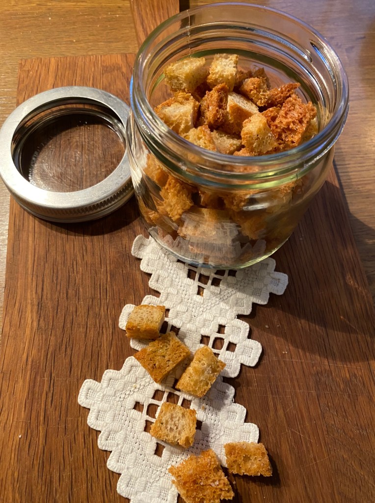 Matnyttig.. Hver dag påpekes det at vi ikke bør kaste mat, her er mitt TIPS til å lage brødkrutonger på en rask måte av et to dager gammelt brød. Tidligere har jeg brukt stekepanne, men denne metoden var mye enklere, og det du har til overs, puttes på et glass, og tas frem etter behov.