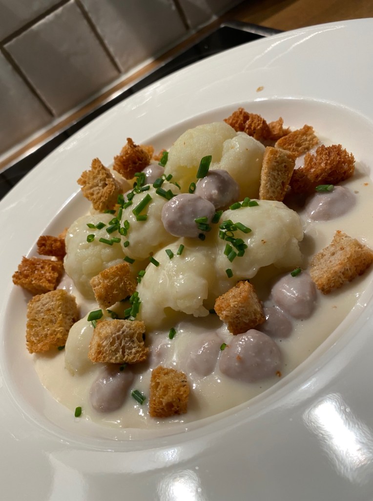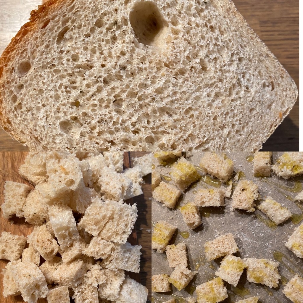 Et halvt 2 dagers krydder/parmesanbrød ( oppskrift ligger på bloggen) deles i skiver, fjern brødrand, skjær i terninger, ha på et bakepapir, hell litt olivenolje over, pluss litt maldonssalt, putt i stekeovn på 180 grader, stek i 15 minutt, snu litt på krutongene etter halv tid. Alle typer lyst brød kan brukes.Etter steking, ha krutongene over på et kjøkkenhånkle, avkjøl, hell på et Norges glass, og ta frem etter behov. Smaker utmerket til supper eller salater, her blomkålsuppe med små kjøttboller.