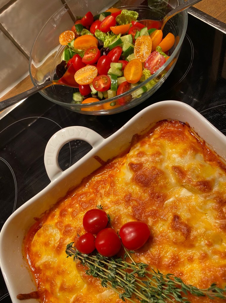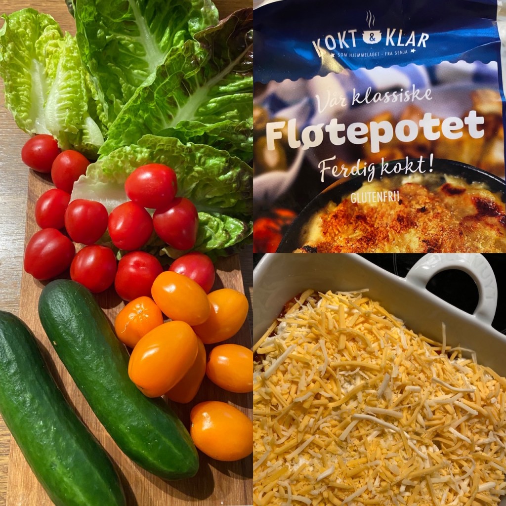 Begynn med kjøttsausen, oppskrift på denne har jeg lagt ut tidligere under navnet Shepherds Pie, den passer seg selv, og bør småkoke i minimum 1 time, helst 2 hvis mulig.Resultatet ble bra, og gjestene var fornøyde, og for en som liker best alt fra bunnen mat, så kan jeg virkelig anbefale denne enkle endring. Anbefaler å bruke en litt større form, slik at fløtepotetene bare danner et tynt lag på toppen. Strø revet ost på toppen, her en blanding av mozzarella og chedder.I grønnsakskuffen, hadde jeg det som trengtes til en salat, smakt til med litt dressing, 1 pose fløtepoteter (kjøpt på coop mega) som faktisk smakte bra.. Garanterer smaken, men har en tid, så lag gjerne fløtepotet fra bunnen.