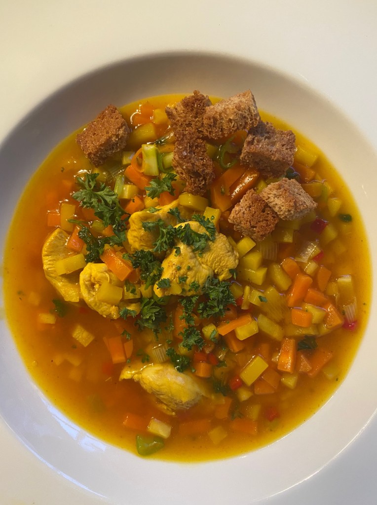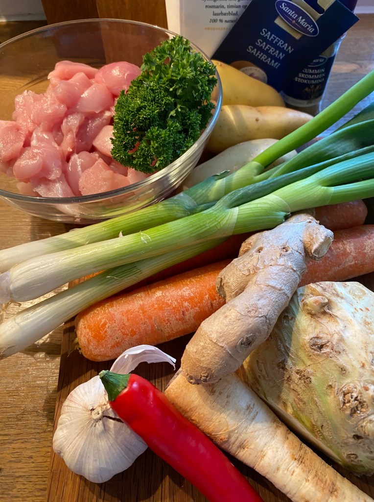 Inspirert av Gladkokken sitt forslag på en god kyllingsuppe som virkelig varmer på denne årstid, her er min, med endel justeringer i forhold til den opprinnelige.. Den er enkel,litt inspirert av det indiske kjøkken,men alikevel laget på gode norske grønnsaker, styrken på krydder velger en etter smak.