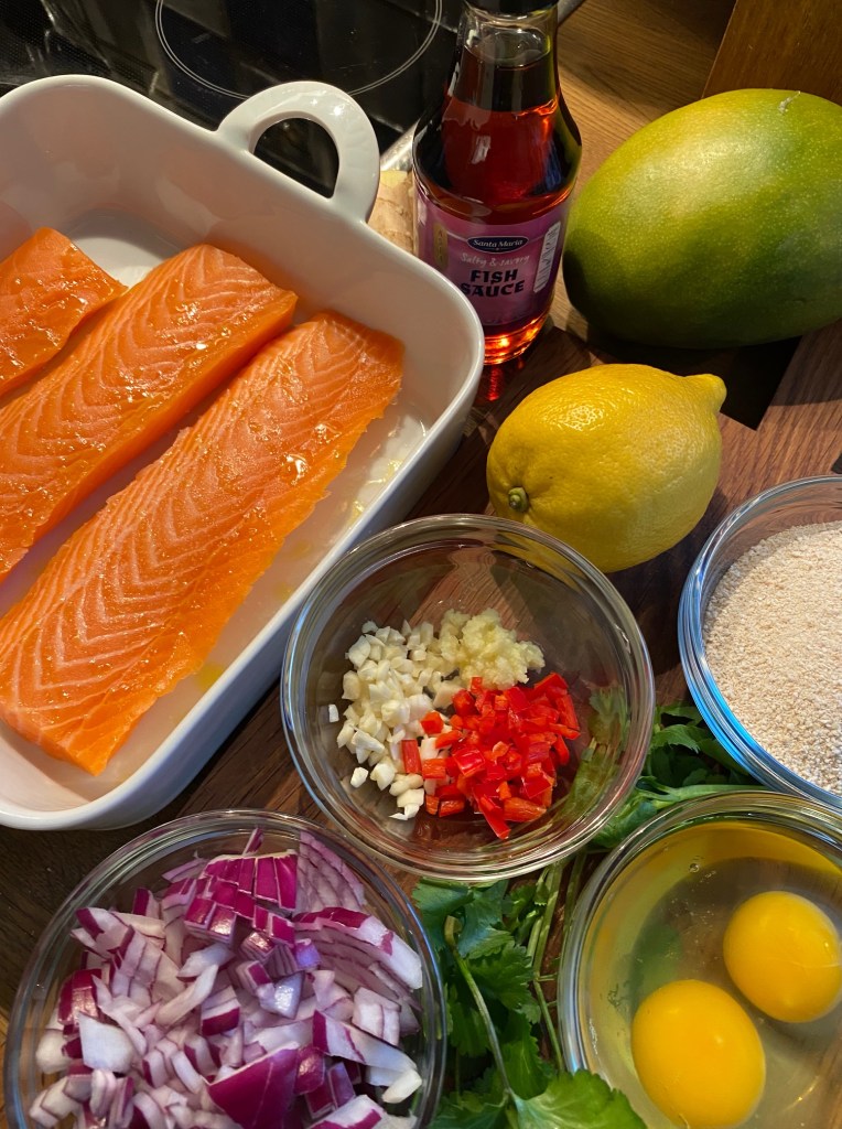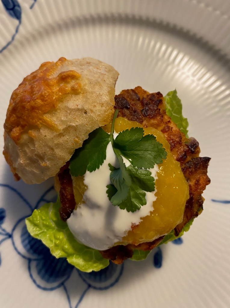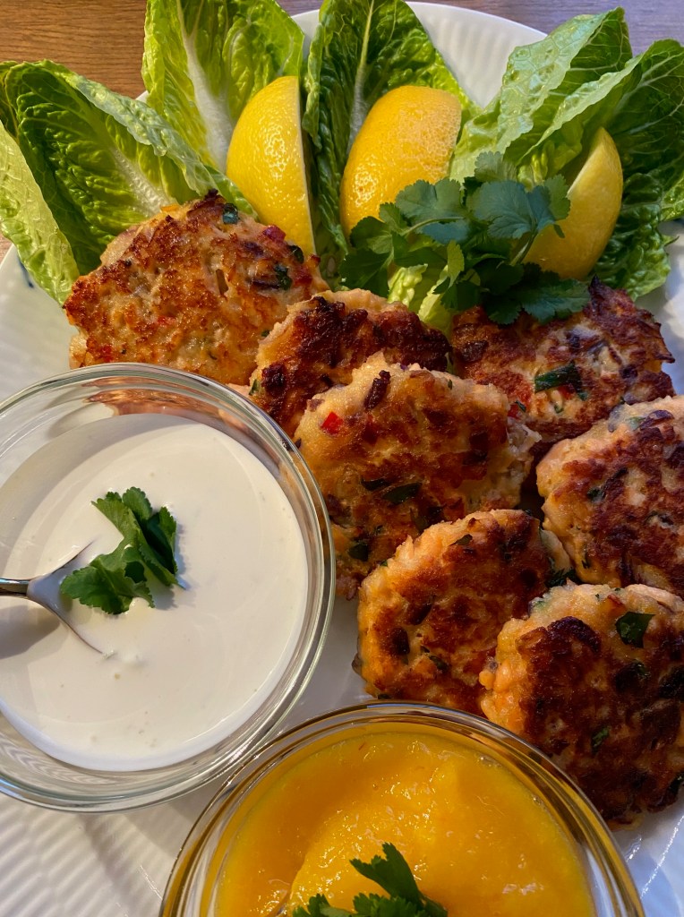 Vi prøver alle å spise minst 1-2 fiskemåltid i uken, i dag falt valget på en god lakseburger, her blir fisken varmebehandlet på forhånd, for deretter å bli tilsatt mye godt tilbehør i farsen.. Her er burgeren servert med brød, salat, mango/sweet chili dip pluss en god rømme dressing.. men server den gjerne med råstekte poteter, og en god salat til.