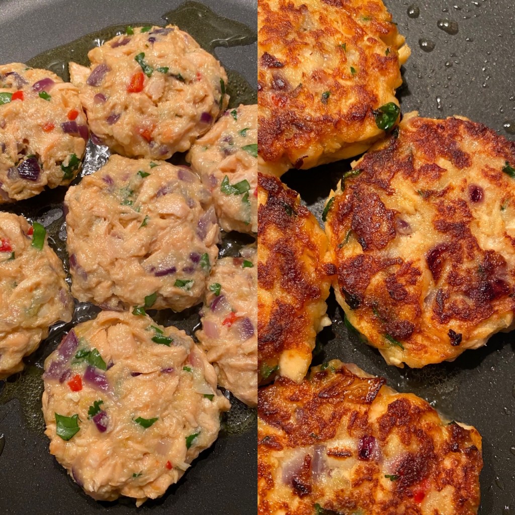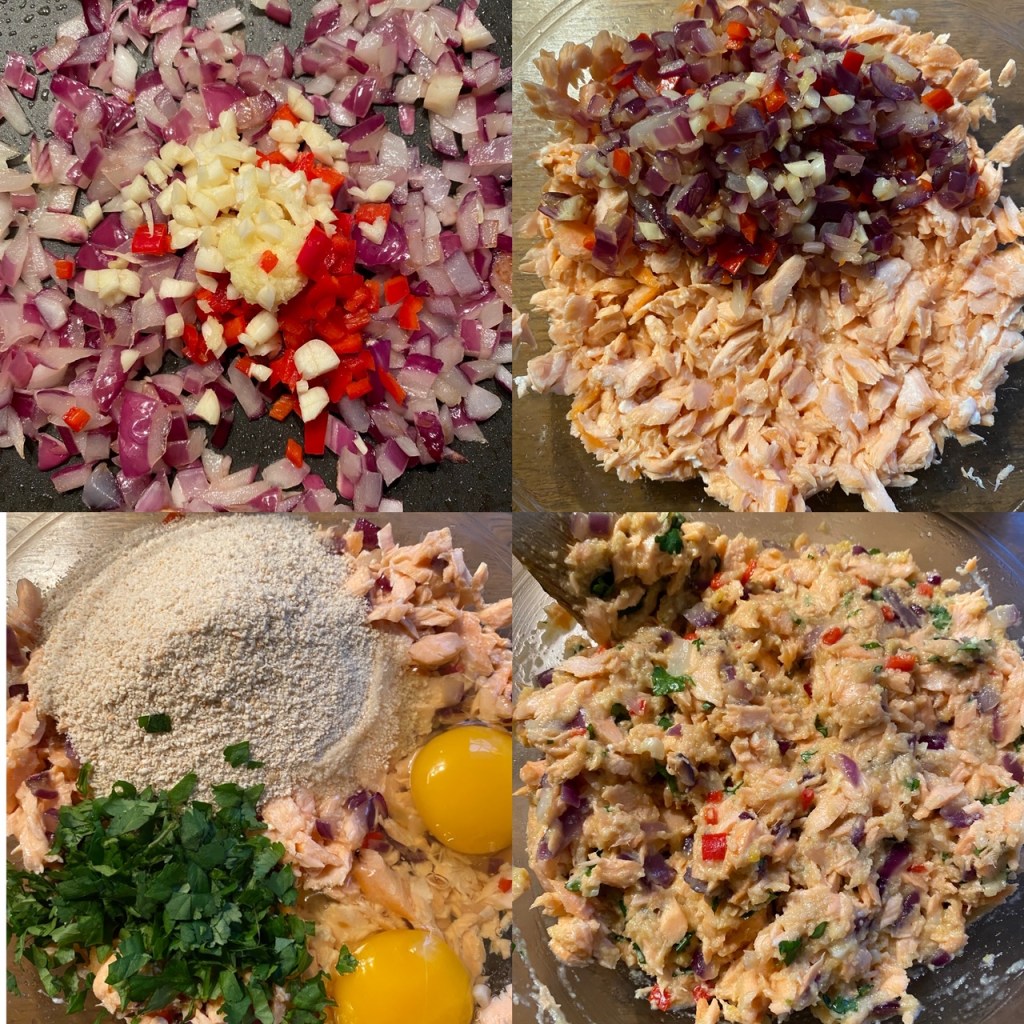 - Tilsett rødløk mix, egg, strøkavring,fiskesaus pluss hakket koriander og bland godt.