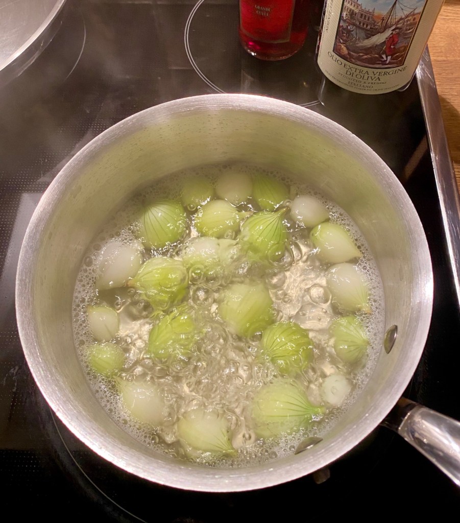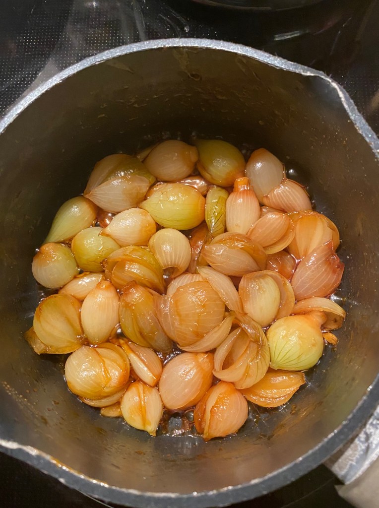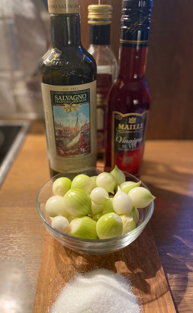Rens løk og kok møre i lettsaltet vann, sil fra og del i to, ta vare på litt av kokevannet. Smelt sukkeret til lys karamell ( bruk kjele uten belegg) tilsett så eddikken. La dette koke til sammen til sirupkonsistens, tilsett eventuelt litt av kokevannet fra løken hvis ikke karamellen løser seg opp. Ha i løk og olivenolje og la løken få ligge å kose seg i laken frem til servering.. sette til side, og varm opp løken i laken før servering.