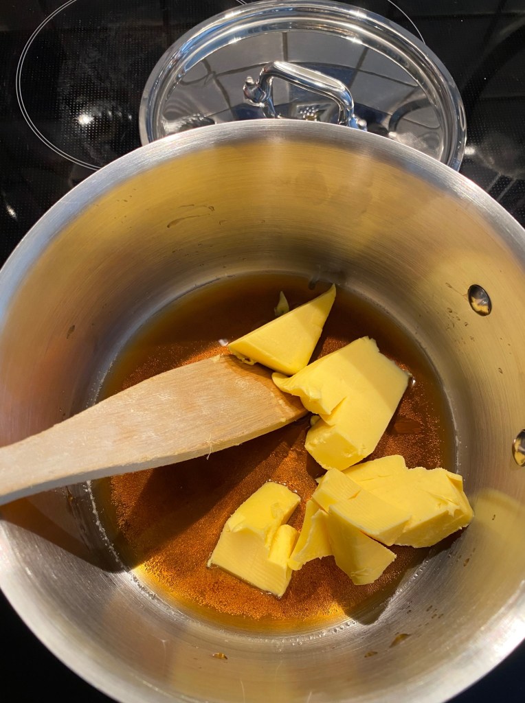 Ha vann, brunt sukker og smør i en gryte, varm opp til kokepunktet, eller til alt er smeltet, trekk gryten av platen, og rør inn sjokoladen, pluss smak til med salt. Rør om av og til under avkjøling slik at glasuren får en fin konsistens.
