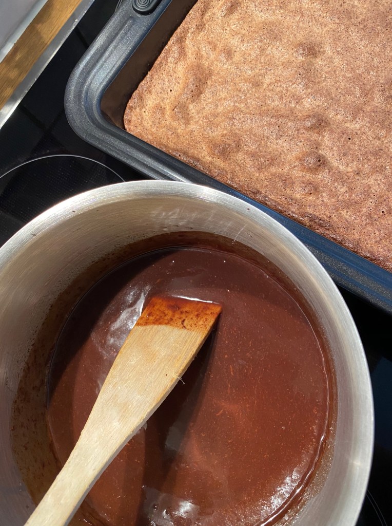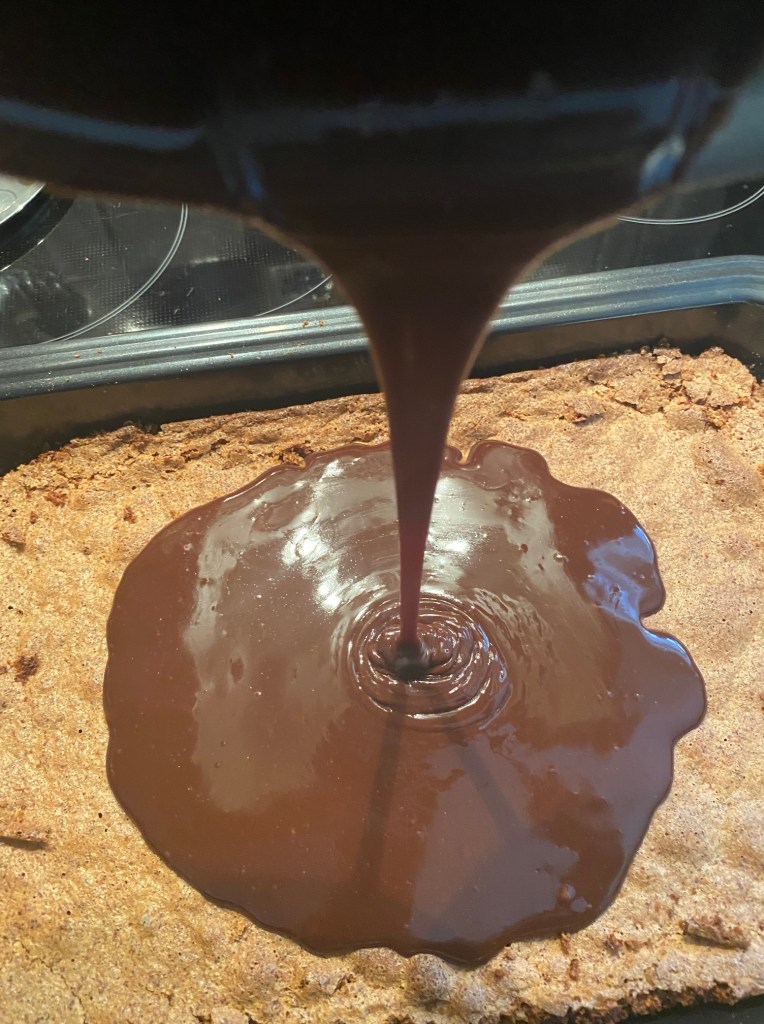 Med tanke for påsken,som snart står for døren, ble denne kaken til. Samme bunn som Tante sin mandelkake, bare denne gang stekt i langpanne, pluss en smakfull salt/søt sjokolade glasur, uten egg og fløte, som gir bedre holdbarhet. Kan lages på forhånd, og fryses, enkel å frakte med seg på tur.