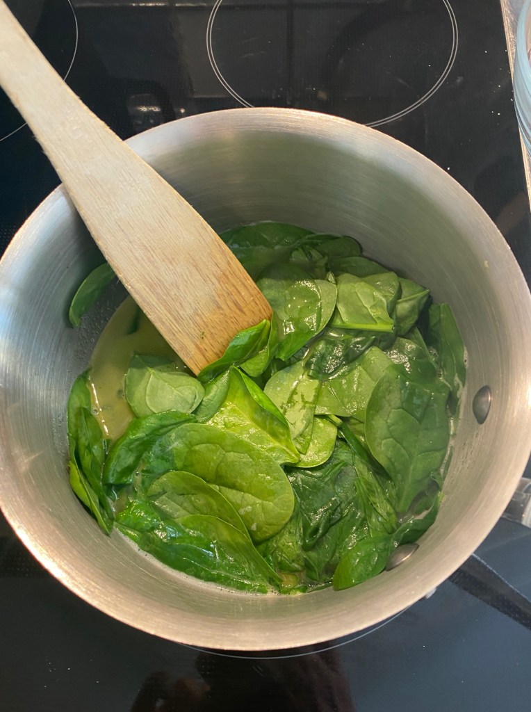 Fisketorget renset kamskjellene, og leverte med skjellene de lå i.. som også ble brukt til serveringsskåler.Kok oppvann/smør , vend inn spinaten forsiktig med en tresleiv, når spinatbladene er myke, legges innholdet over i et dørslag , la dette renne av seg.. kok så opp fløten, krydre med hvit pepper og smak til med salt, vend så inn spinaten.. ( hvis du lager retten i god tid , husk å avkjøl sausen før du tilsetter kamskjellene)Marinade til kamskjellene, smelt 2 sps smør i stekepanne, finhakk sjalottløken og surr den blank, hell dette ut på et stor flat tallerken, hakk estragonbladene i små biter og bland inn.. Del kamskjell i 3-4 skiver, alt etter størrelse, og vend skivene i sjalottløkblandingen slik at alle skivene får blandingen på seg, slik bildet viser.De fire tomme kamskjellene vaskes godt. Spinatblandingen fordeles i bunnen, og kamskjellskivene legges pent på toppen slik bilde viser, kvern litt havsalt på toppen. Skjellene er nå klare for ovnen, og kan vente i kjøleskap til gjestene kommer, eller stekes omgående på 200 grader i ca 7-8 minutter. Bruk en passe langpanne, bruk folie i langpannen til å støtte opp skjellene med, hvis nødvendig.Klar til servering, På hver porsjonstallerken drysses en haug med grovt salt, så skjellene kan hvile støtt..