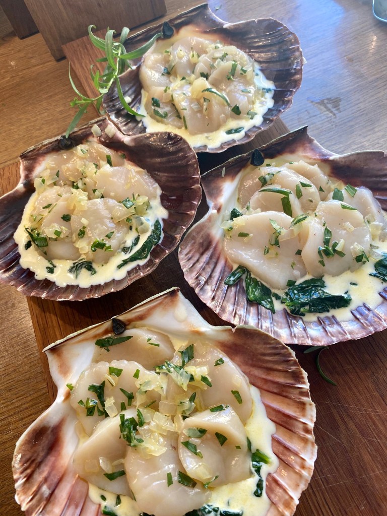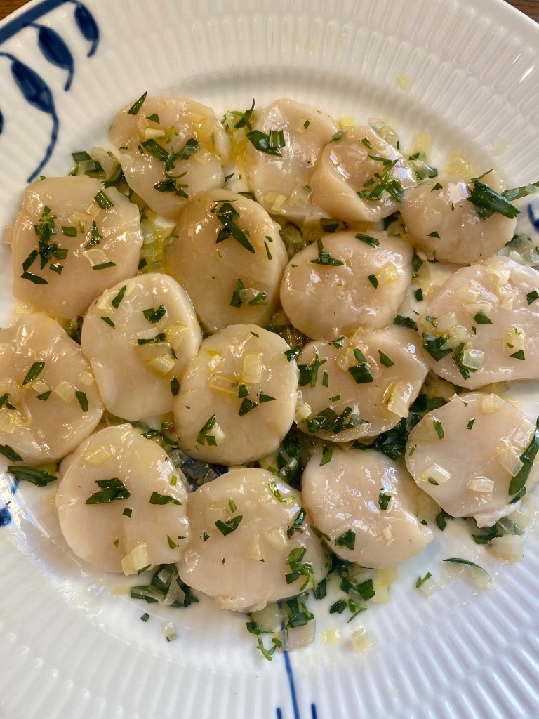 Ovnsbakte kamskjell med frisk estragon og sjalottløk.