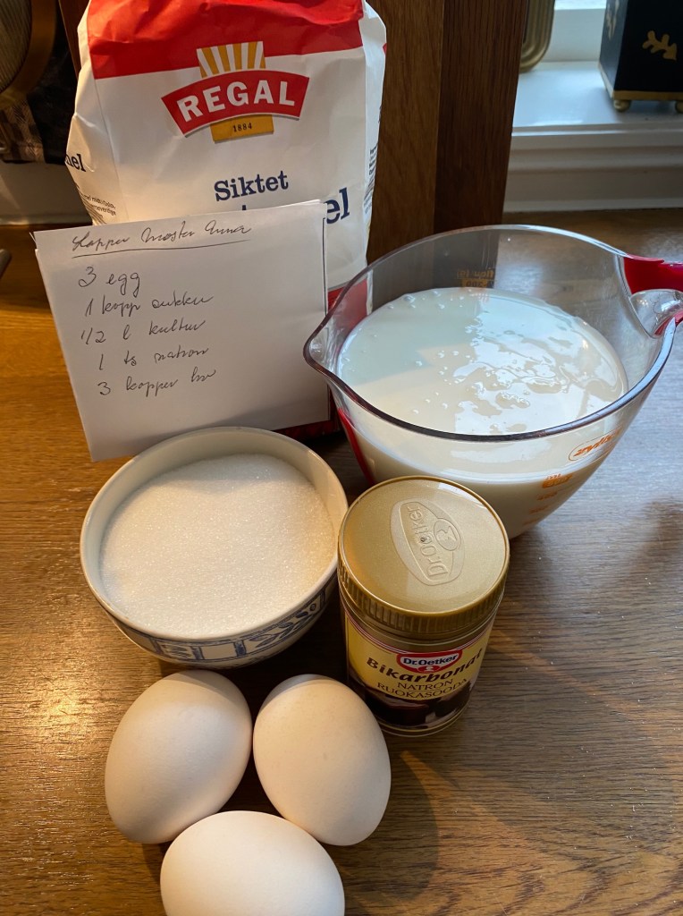 Visp egg, sukker og natron lett sammen, spe vekselvis med mel og kulturmelk til en glatt fin røre, la dette svelle i ca 30 minutt.. så enkelt, og så godt.