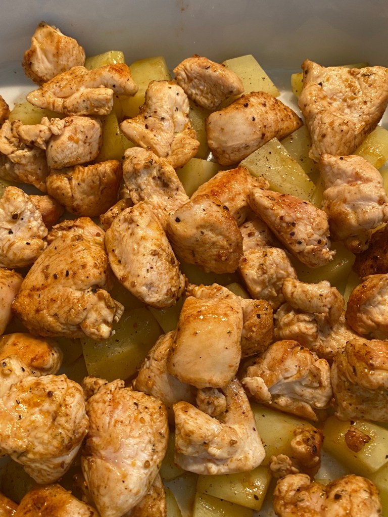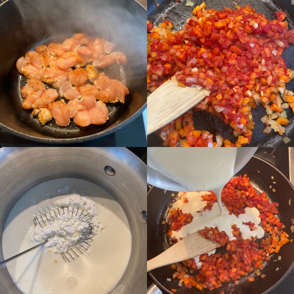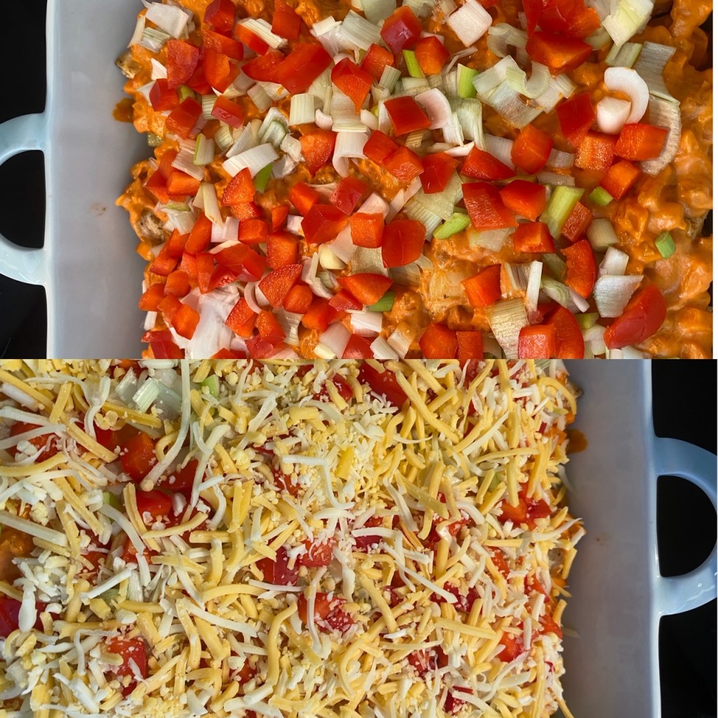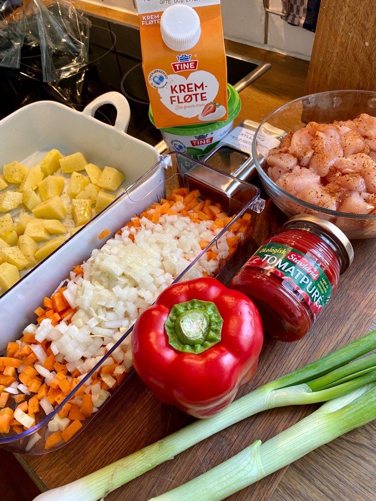 Start med å finne frem alle ingredienser, kutt poteter i terninger ha litt olivenolje pluss salt/pepper over, skjær kyllingfile i passe biter, og vend disse i kyllingkrydder, hakk løk, hvitløk, gulrøtter, chili.. topping er hakket paprika og vårløk.Sett potetene inn i forvarmet ovn på 200 grader, stek i ca 12 minutt, imens gjøres resten klar. Visp sammen maizena, fløte og rømme ( ikke kok dette opp) Stek kyllingbitene raskt, trekk disse til sides. Ha litt olje i en stekpanne og mykne de hakkede grønnsakene lett i ca 5 minutt, tilsett tomatpure og surr dette i 1 minutt, tøm så over sausen , gi et oppkok.Her har sausen, etter oppkok, smak til med salt/pepper, litt cayennepepper etter smak. Pluss balsamico.Ta ut potetene, og fordel kyllingbitene utover, deretter sausen.Øverste bilde, dryss over hakket paprika og vårløk, så ønsket ost på toppen, her en blanding av chedder og mozarella, sett tilbake i ovnen, og etterstek i 30 minutt på 200 grader.Her klar til servering.