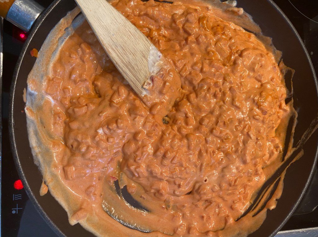 Visp dette godt sammen uten oppkok, hell over grønnsaksblandingen slik bilde viser.